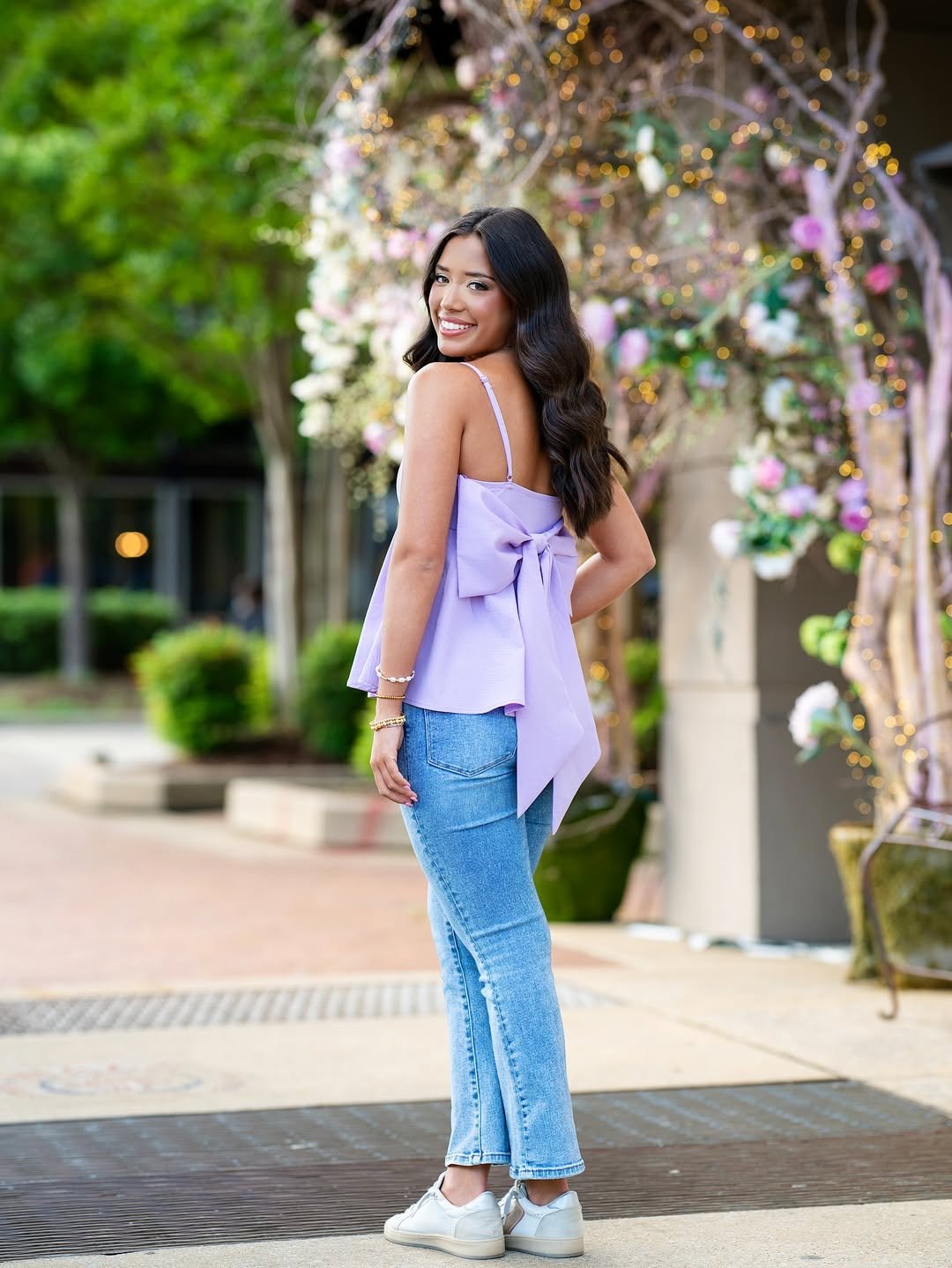 Light-wash slim jeans and a lilac bow-back top bring a playful twist to a classic silhouette. From the front it’s simple, but turn around and that oversized bow steals the scene.