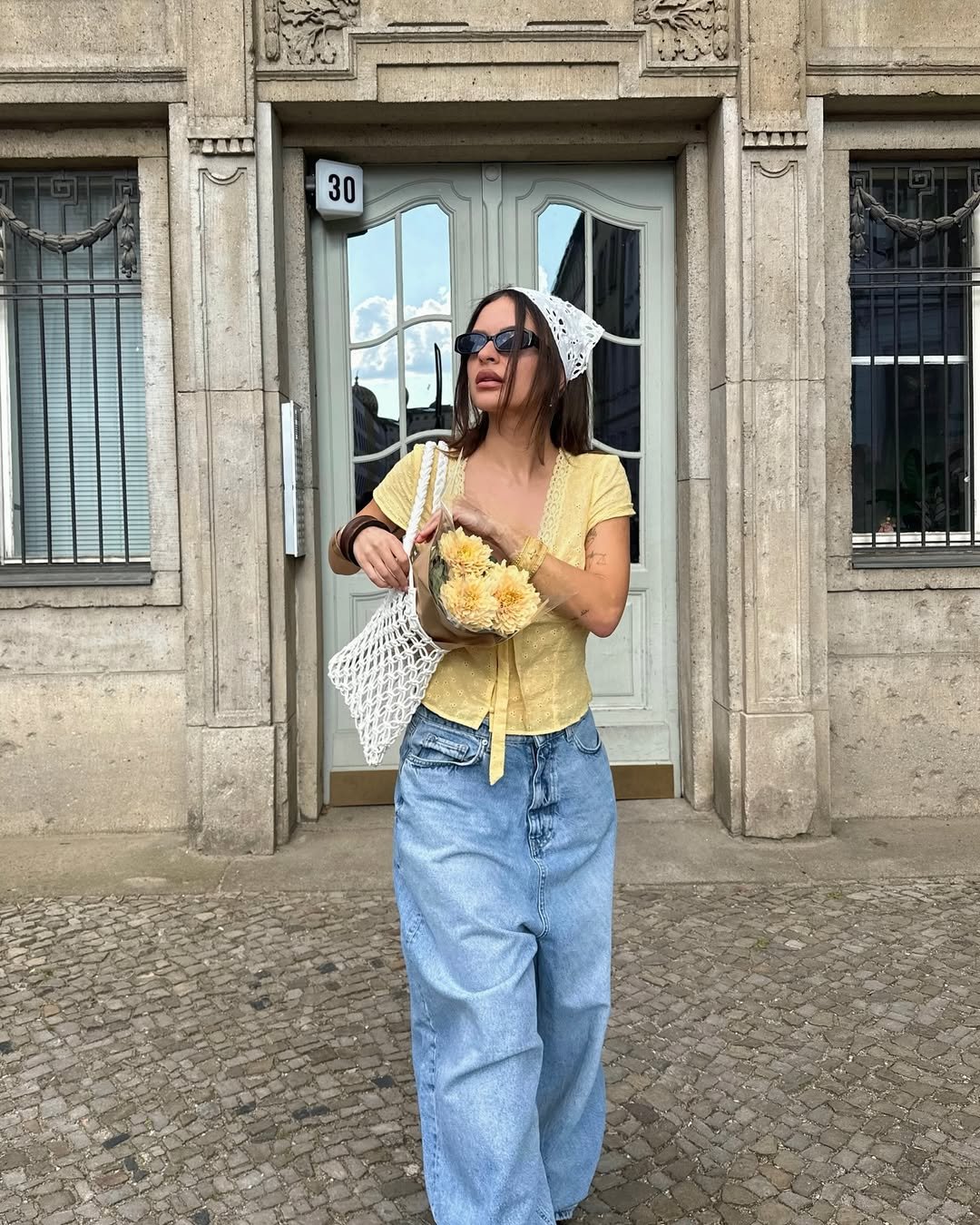 I love how the net bag and fresh blooms make it feel like a market morning in Europe. It’s feminine without being precious. Add simple flats or sneakers, and suddenly your everyday jeans feel like part of a little love story.