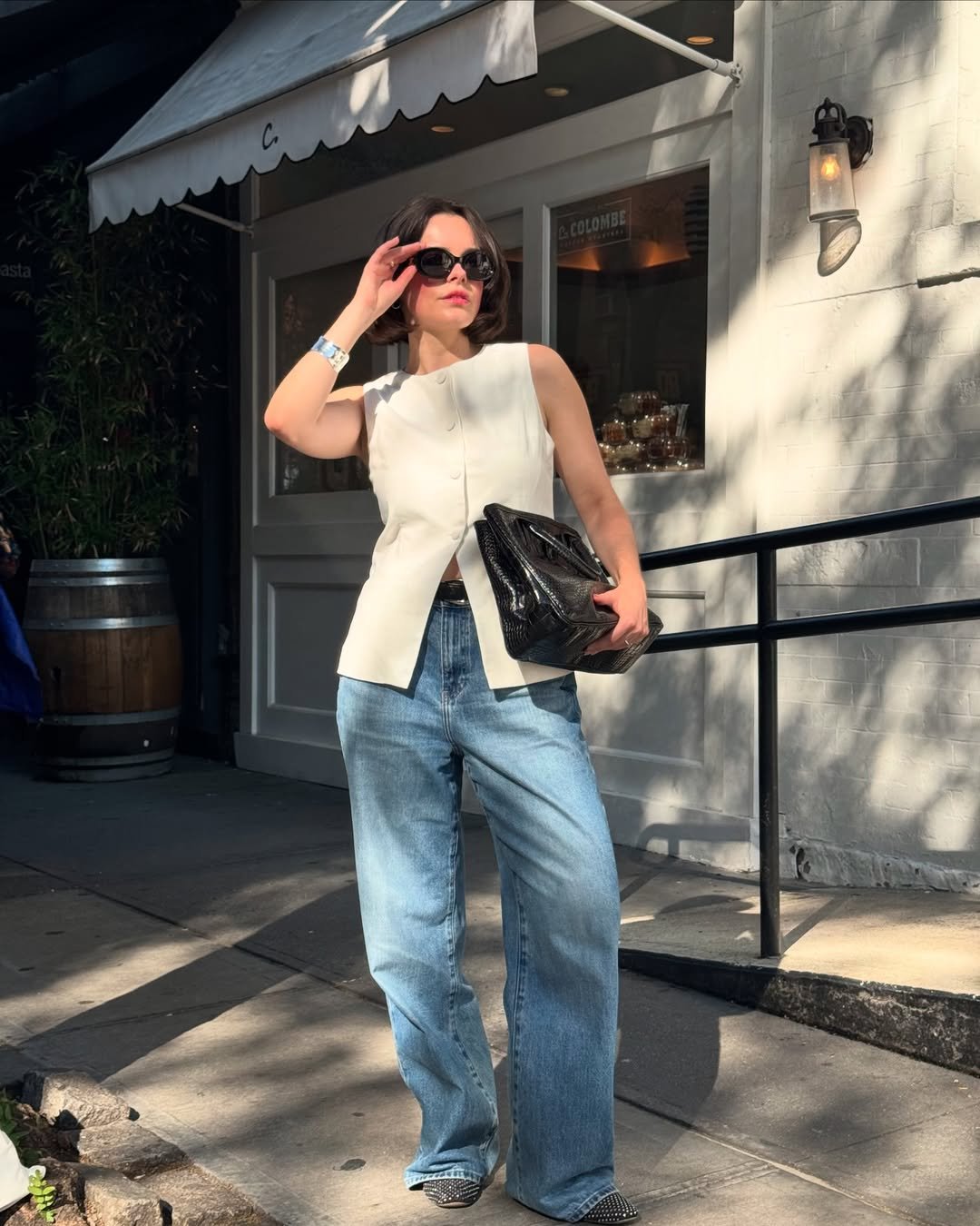 A tailored sleeveless cream vest paired with relaxed wide-leg jeans feels sharp and modern. The clean neckline and structured buttons add polish, while the denim keeps the mood easy.