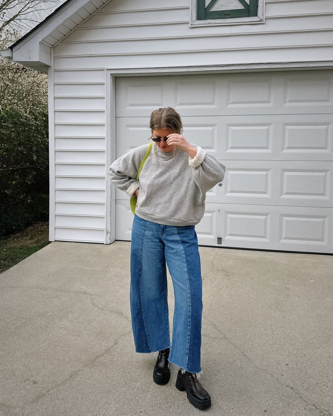 A slouchy gray sweatshirt paired with wide-leg jeans is proof that comfort can still look styled. The high rise elongates the leg, and chunky black boots add just enough edge to keep it interesting.