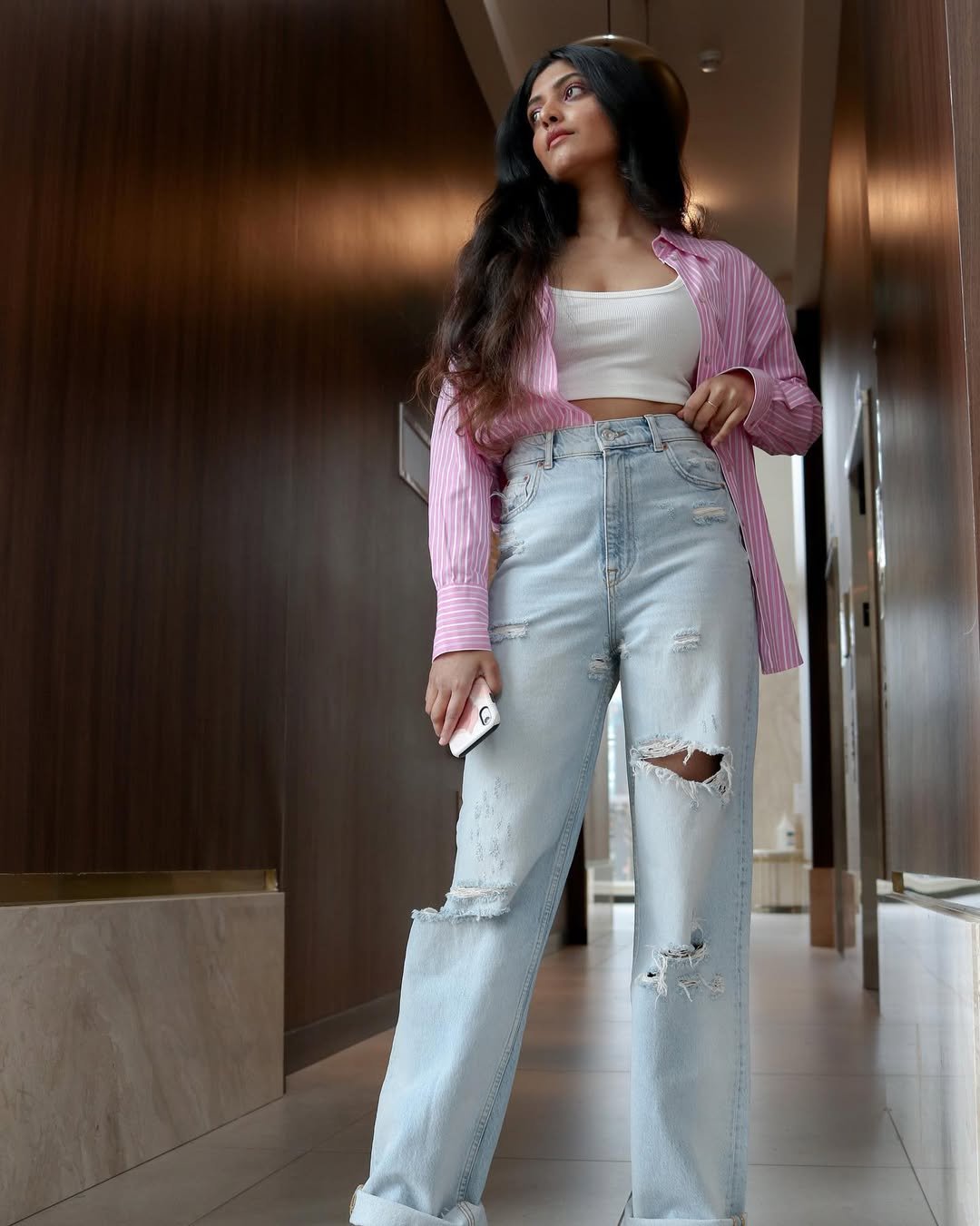 Light distressed jeans styled with a crisp white tank and a pink striped button-down feel playful and modern. The open shirt adds movement, while the high waist keeps it balanced.