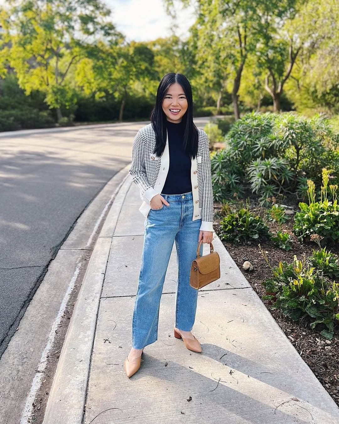 Light-wash straight jeans, a soft neutral tee, and a textured cream jacket feel made for spring mornings under pink blooms. The gold buttons and quilted texture elevate the simplicity without overpowering it.