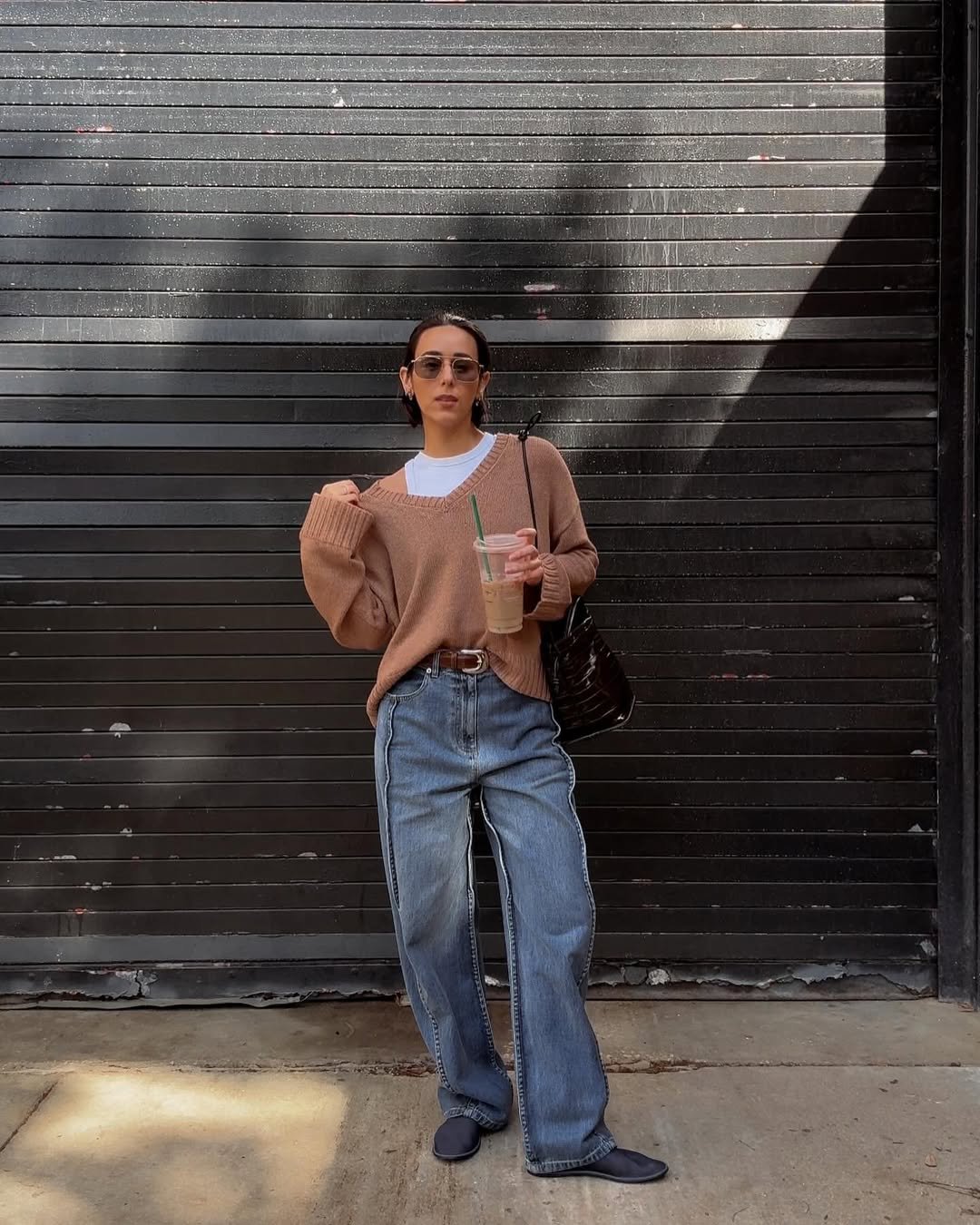 An oversized camel knit layered over a crisp white tee with wide-leg jeans leans into that cozy, borrowed-from-the-boys energy. The slouchy fit feels effortless, but the tucked front keeps it intentional.
