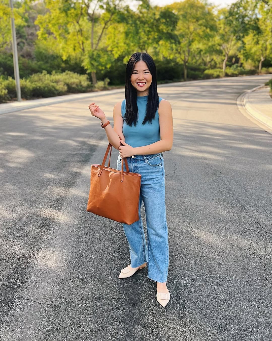 A fitted teal sleeveless top tucked into high-rise straight jeans is minimal done right. The clean lines let the silhouette shine, and that warm brown tote adds a soft contrast against the blue.