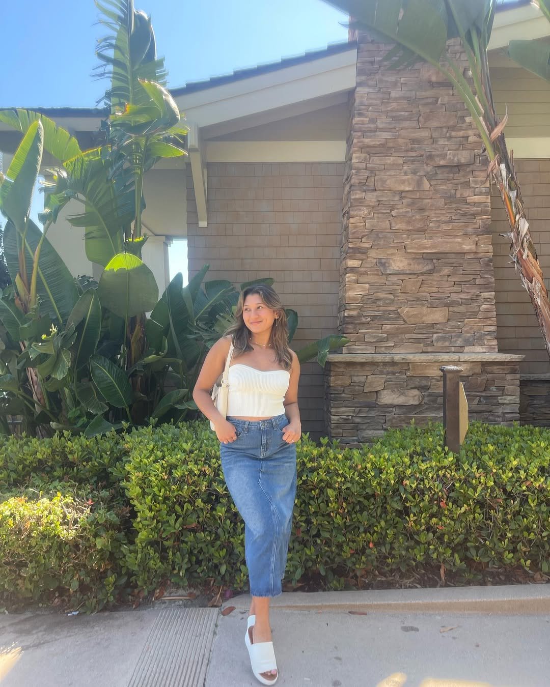 A ribbed white tube top styled with a classic denim midi skirt feels fresh and warm-weather ready. The high waist elongates the frame, while white slides keep it easy.