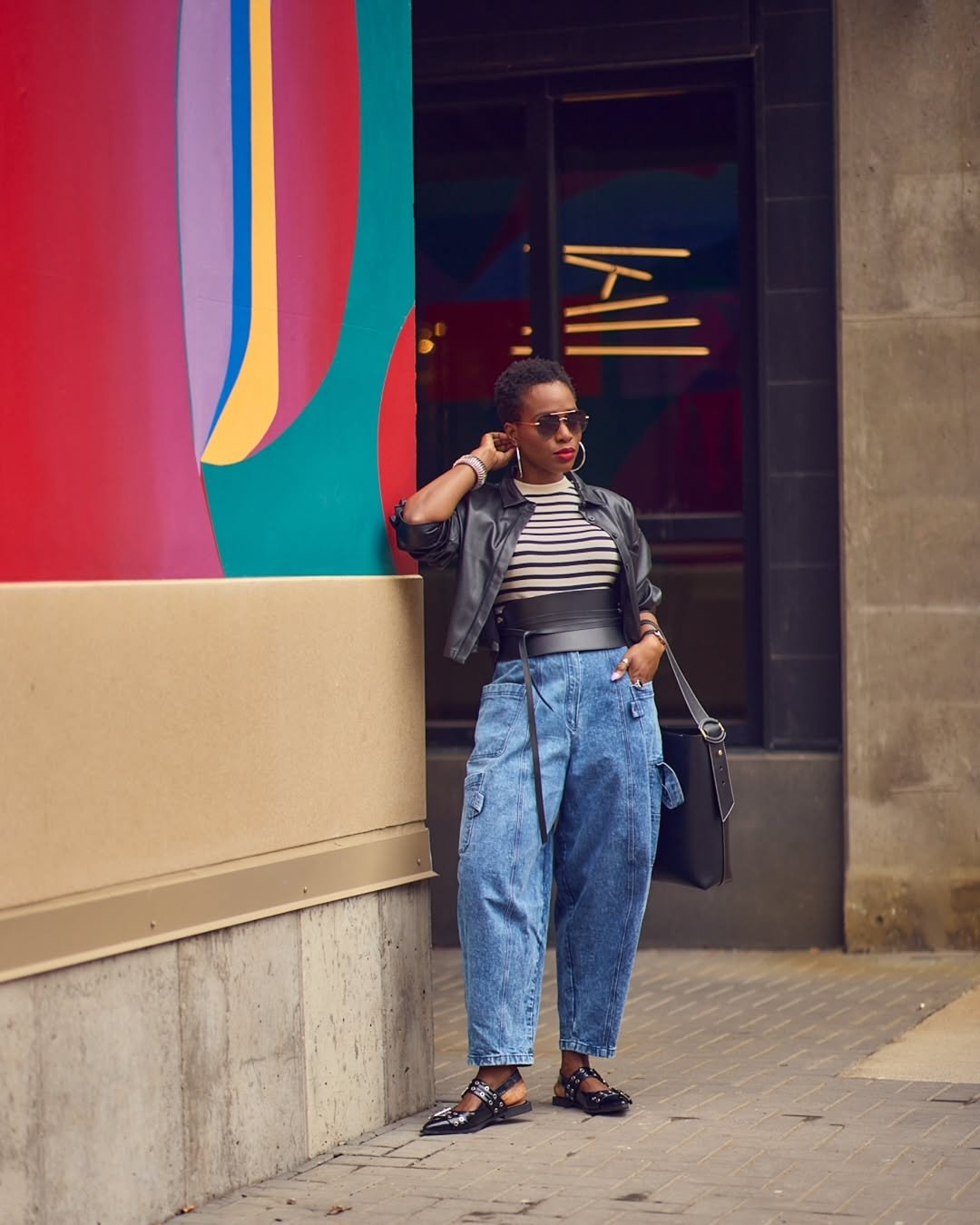 High-waisted barrel jeans, a striped knit, and a cropped leather jacket make this feel like spring in the city with a little attitude. The cinched waist detail adds shape, while the relaxed denim keeps it effortless.