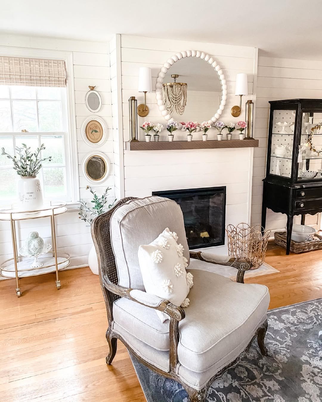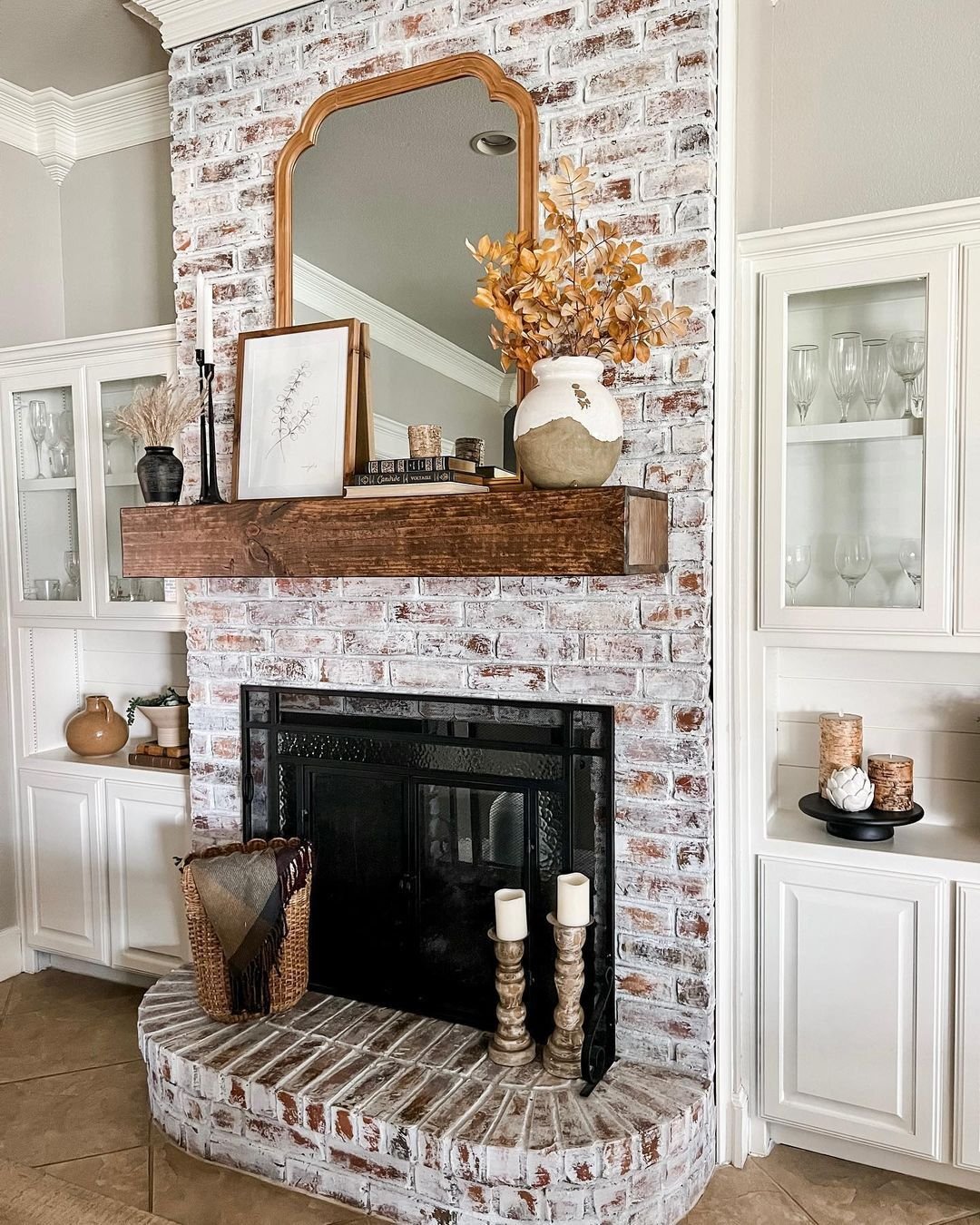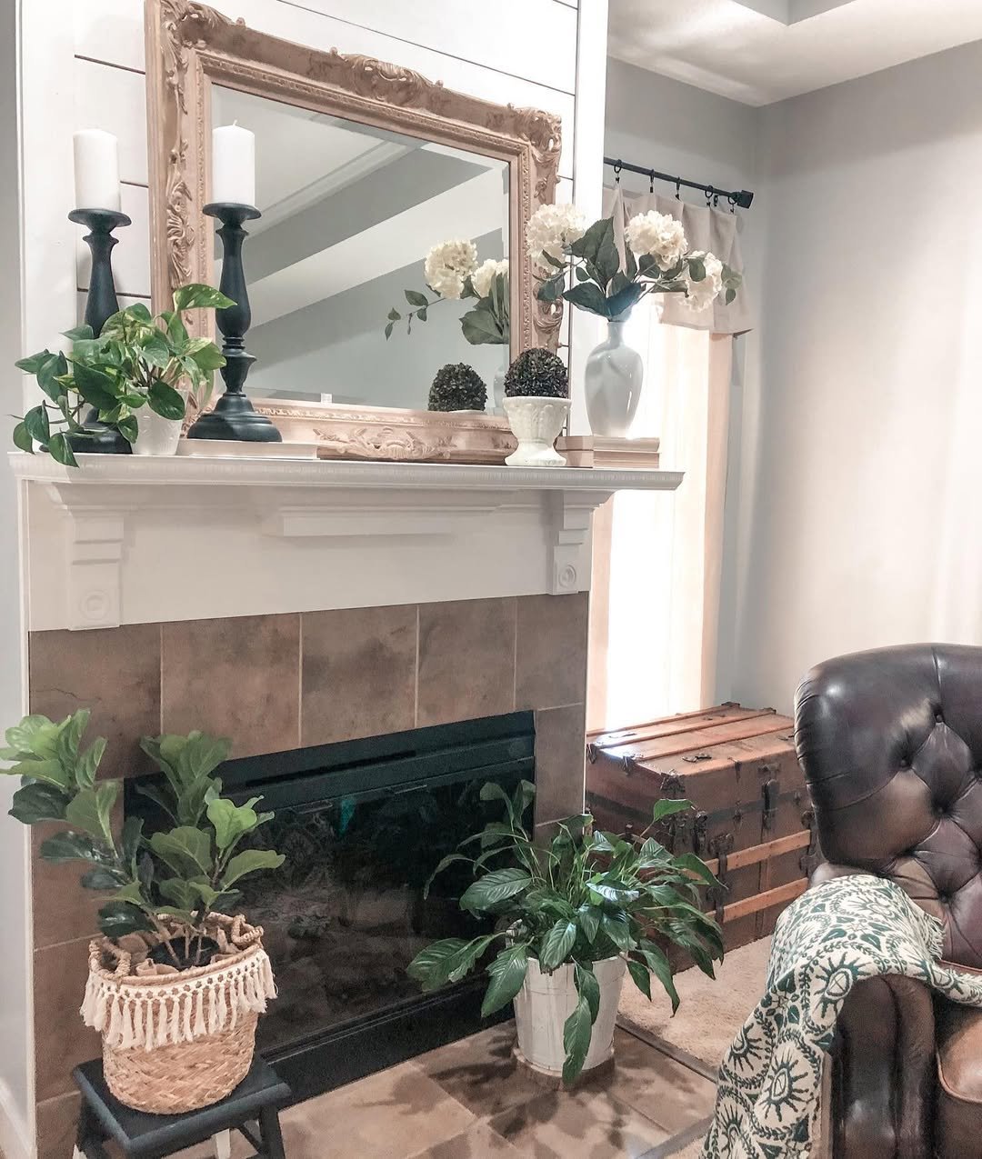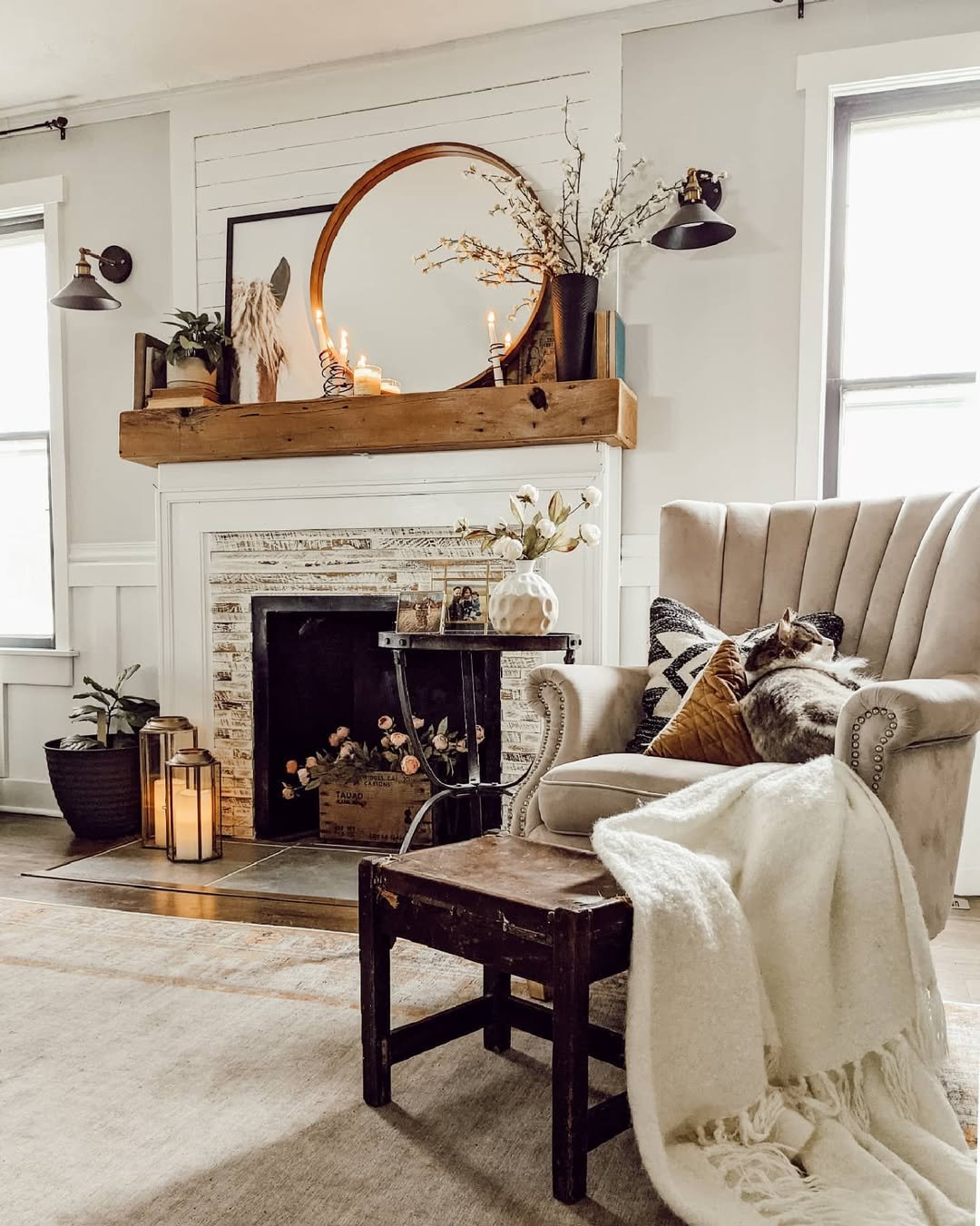 I love how the styling extends beyond the mantel. The tray of blooms, the layered throws, even the baskets nearby, it all works together to create a lived-in calm that feels effortless and deeply comforting.
