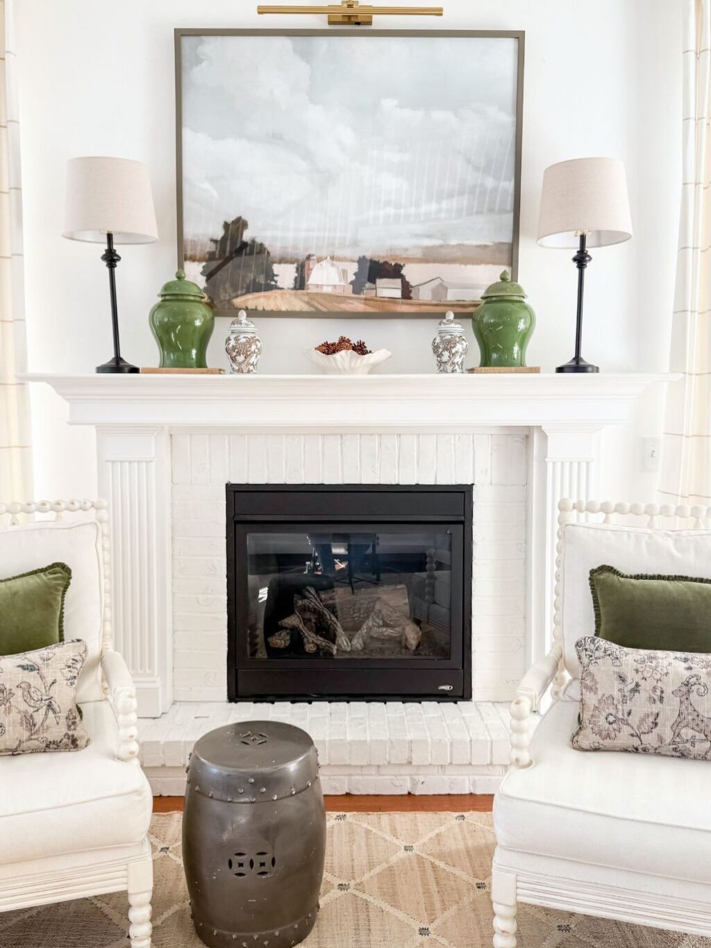 There’s something so satisfying about a perfectly balanced mantel. The matching lamps and greenery create structure, while the artwork above keeps it grounded.