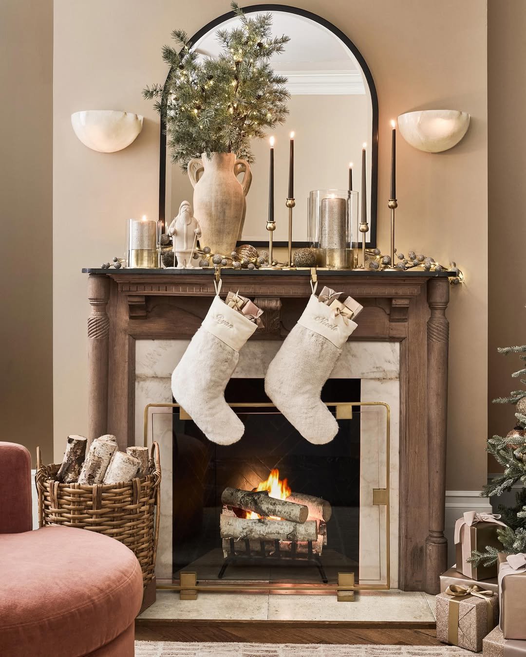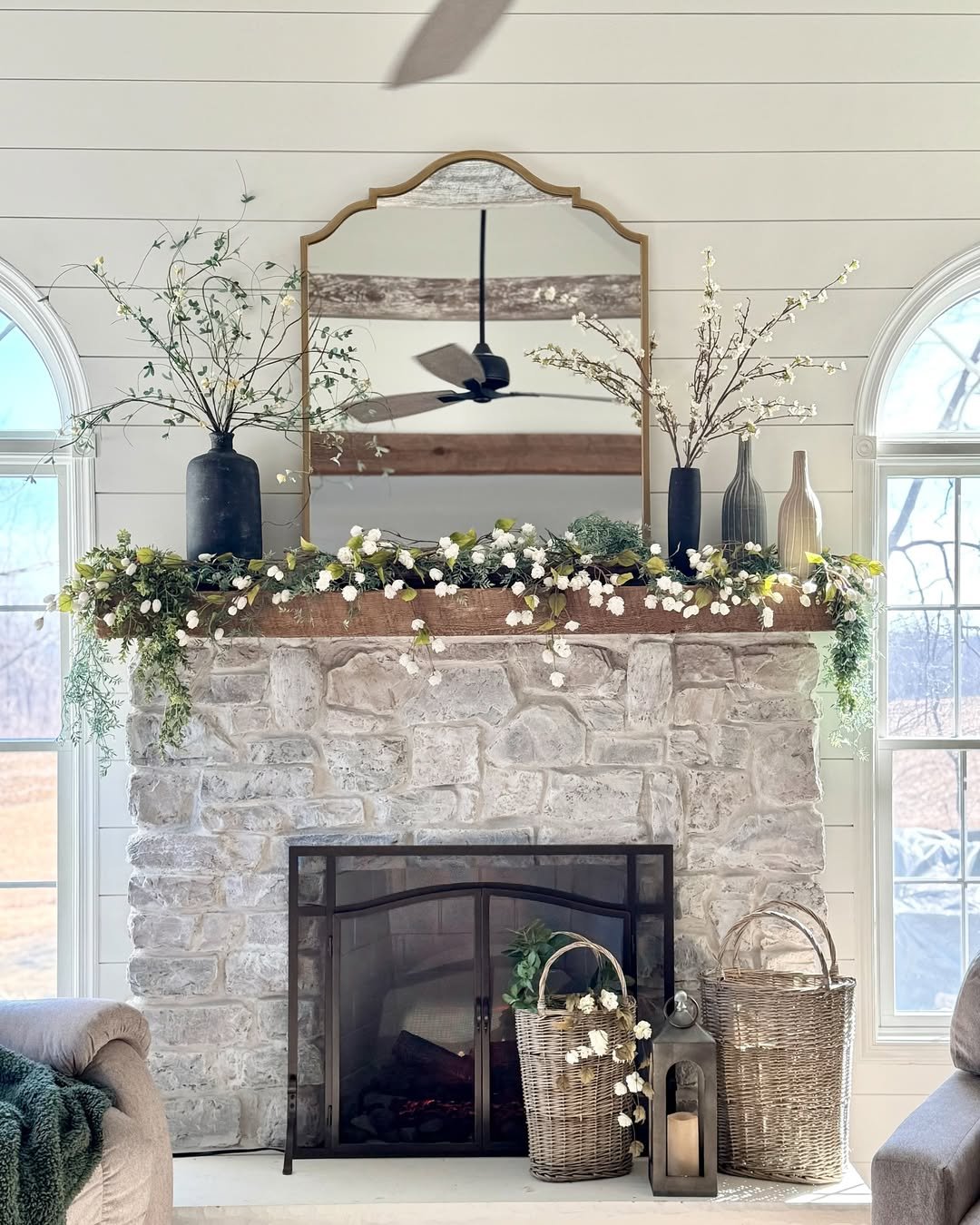 This mantel leans into symmetry, but keeps it relaxed with loose greenery and airy branches. The stone backdrop gives it weight, while the soft florals draping across the beam soften everything just enough.