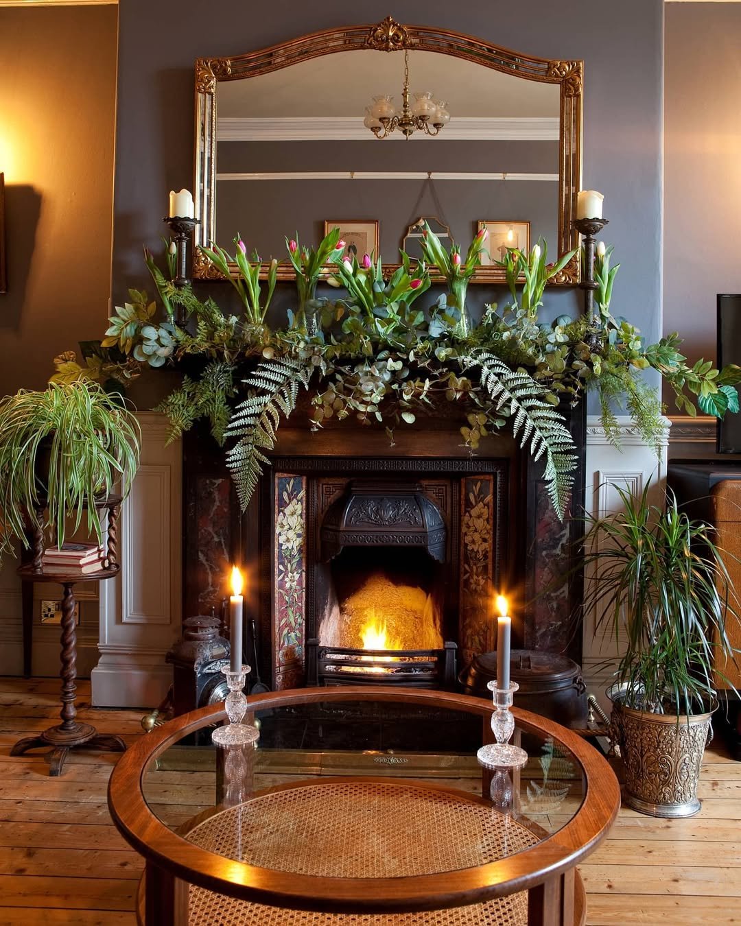 This one leans into that fresh-cut garden feeling, where tulips stand tall among cascading greens and ferns. The darker fireplace backdrop makes every leaf pop, creating a layered look that feels rich but still grounded in nature.