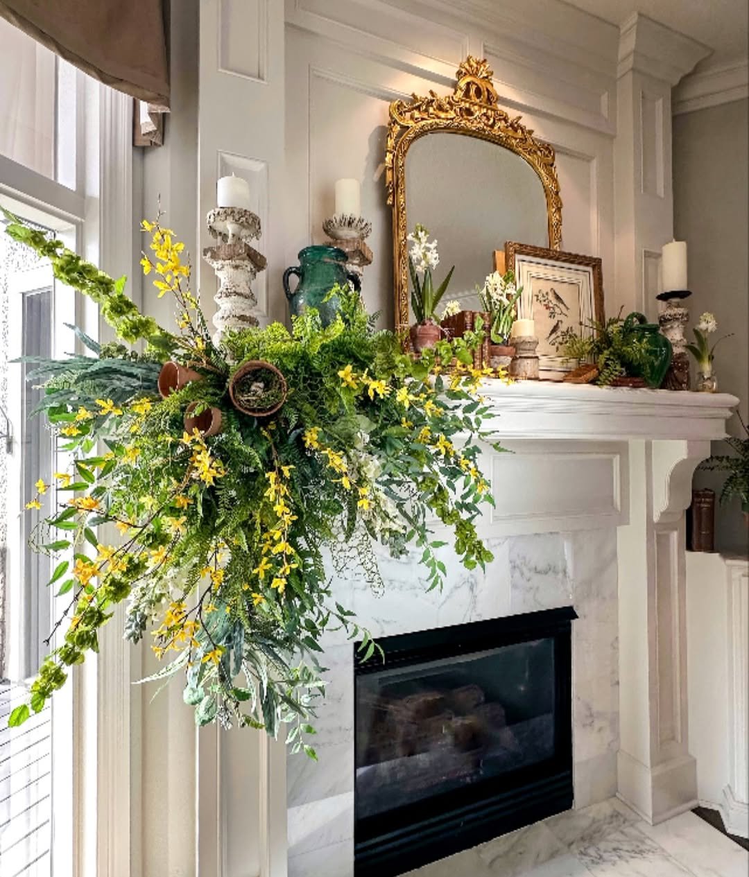 This one feels like spring spilling into the room. The cascading greenery and yellow blooms bring movement and life, almost like the mantel can’t quite contain it all.
