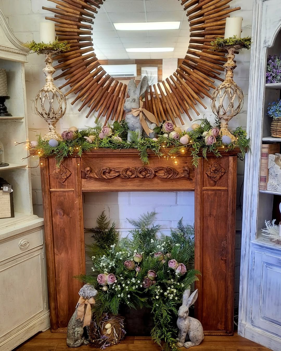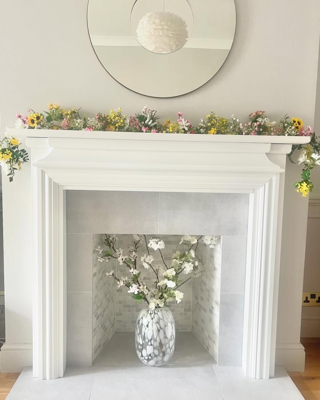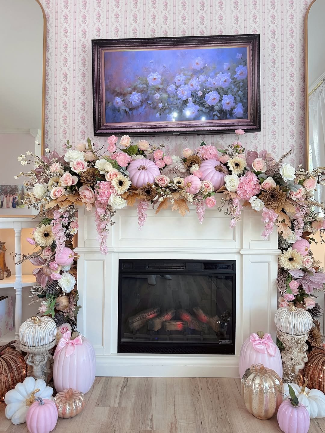 If spring could be bottled into a mantel, this might be it. Pastel florals cascade down both sides, wrapping the fireplace in a soft, dreamy palette of blush, cream, and muted greens.