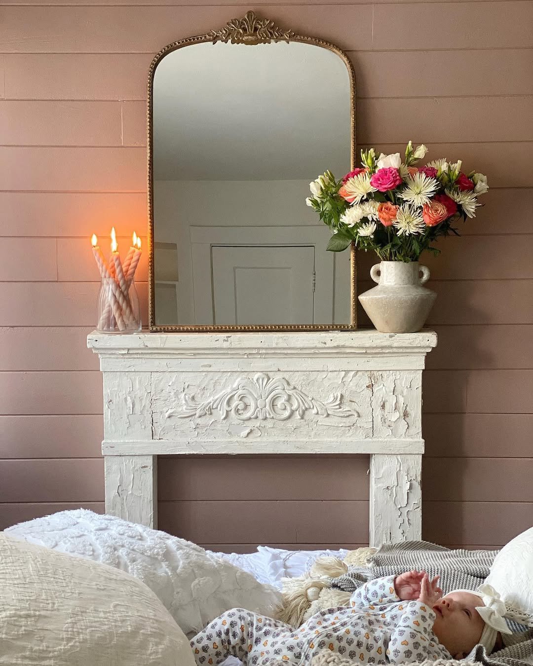 This mantel feels like stepping into a soft spring morning. Layers of blush florals spill across the ledge, weaving through candlelight and delicate greenery in a way that feels both styled and effortless. The gold mirror adds just enough structure, grounding all that softness without taking away from the romance.