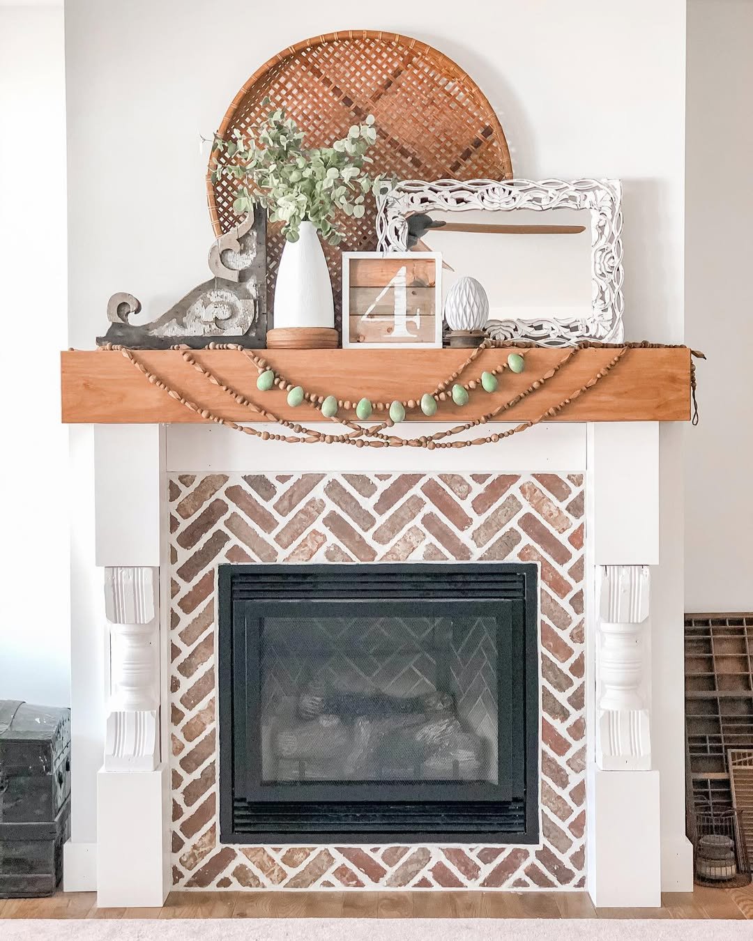 This mantel has that signature layered farmhouse charm, but with a playful twist. The beaded garland, soft greenery, and mix of carved wood and metal accents keep your eye moving without overwhelming the space.