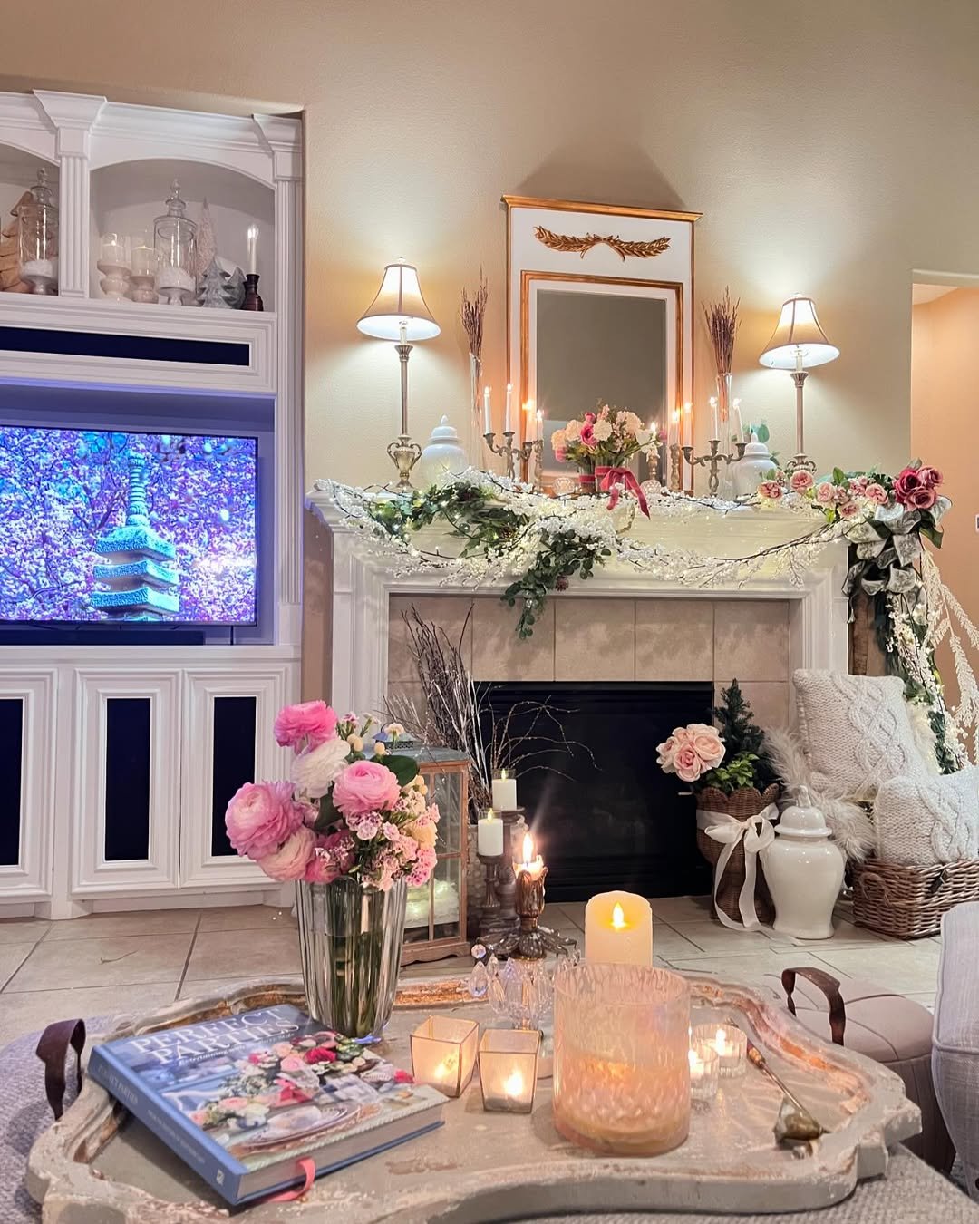 There’s something almost storybook about this setup. The blush-toned florals cascading across the mantel, paired with that soft candlelight and golden accents, create a warm, romantic glow that feels just a little magical.