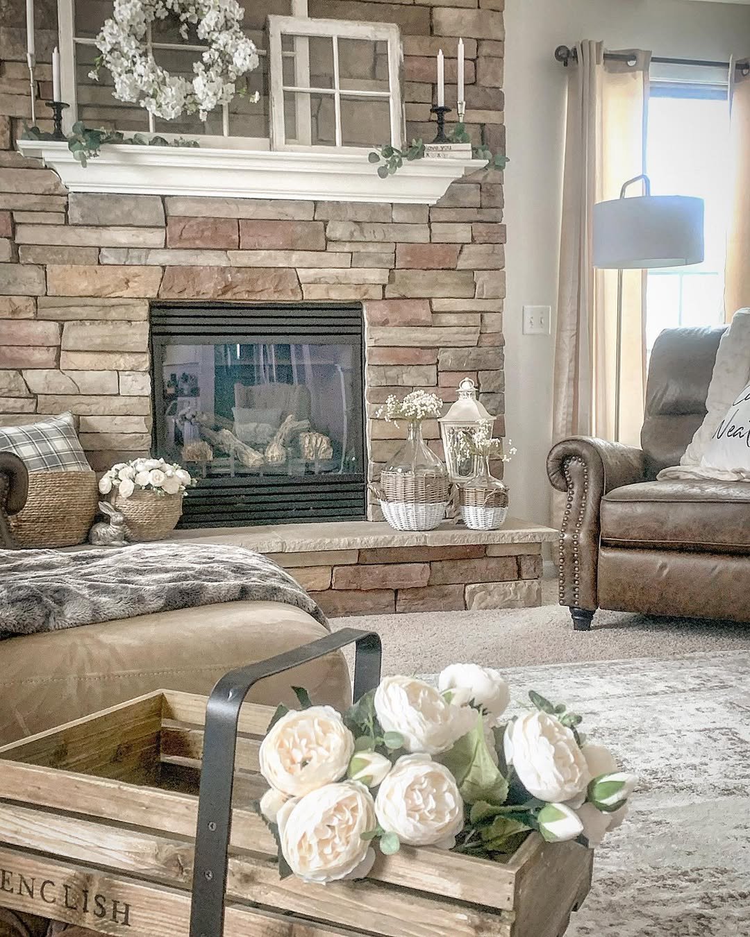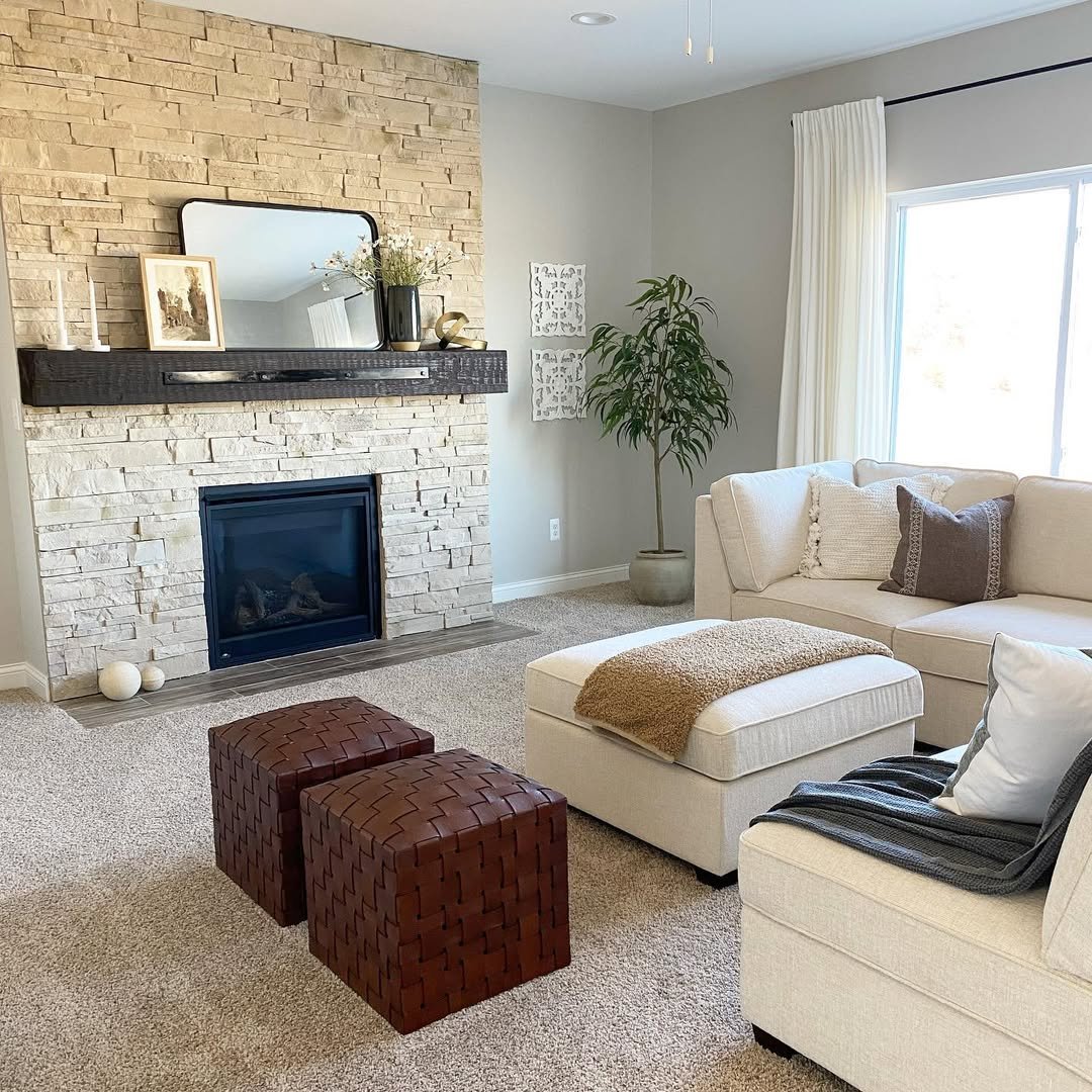 This space feels like a quiet Sunday morning wrapped in linen and warm light. The stone fireplace grounds everything, while those soft cream florals and woven textures gently soften the edges, making the whole room feel inviting without trying too hard.