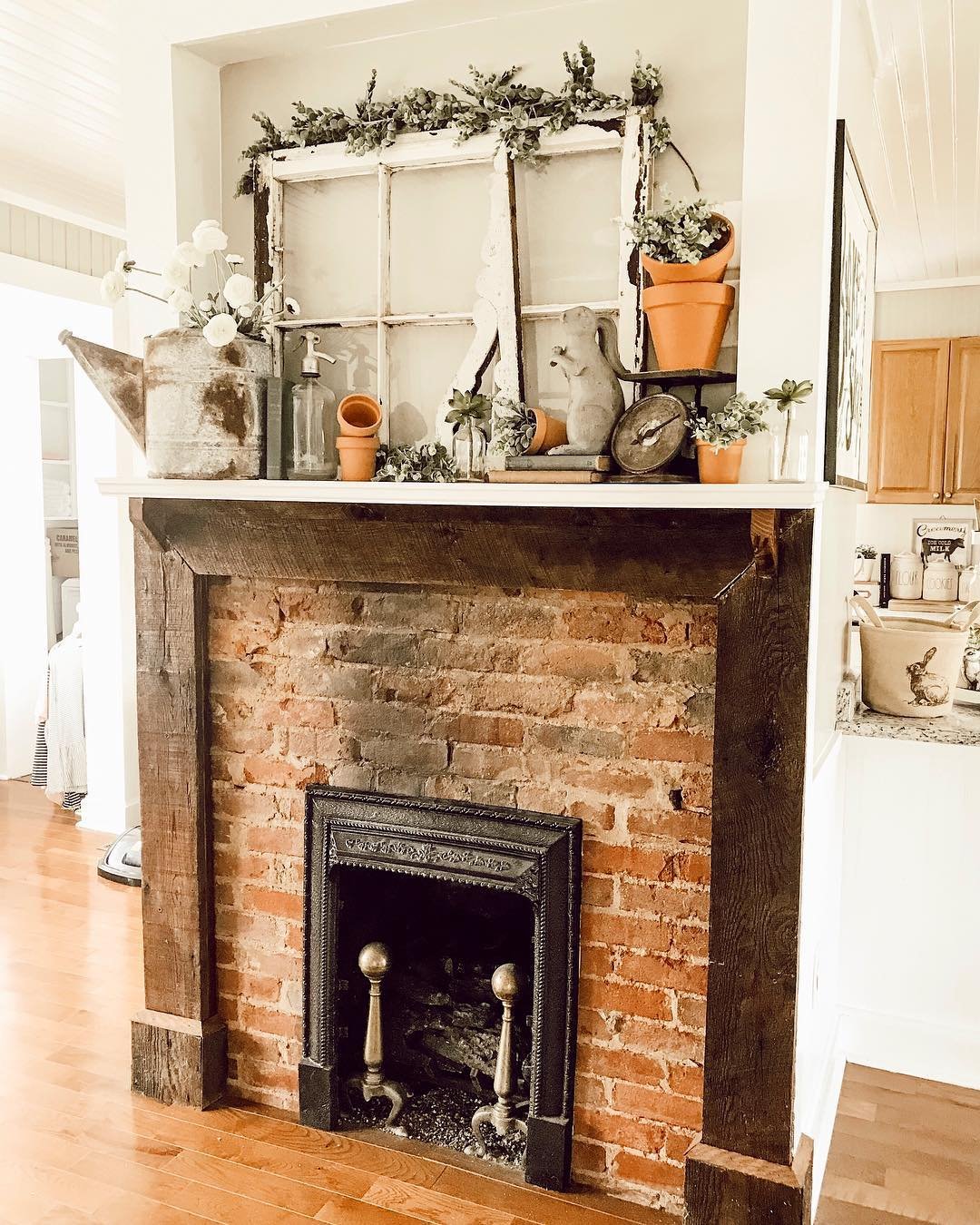 This mantel feels like a collected garden vignette brought indoors. Old window frames, terracotta pots, and trailing greenery come together in a way that feels both curated and delightfully imperfect.