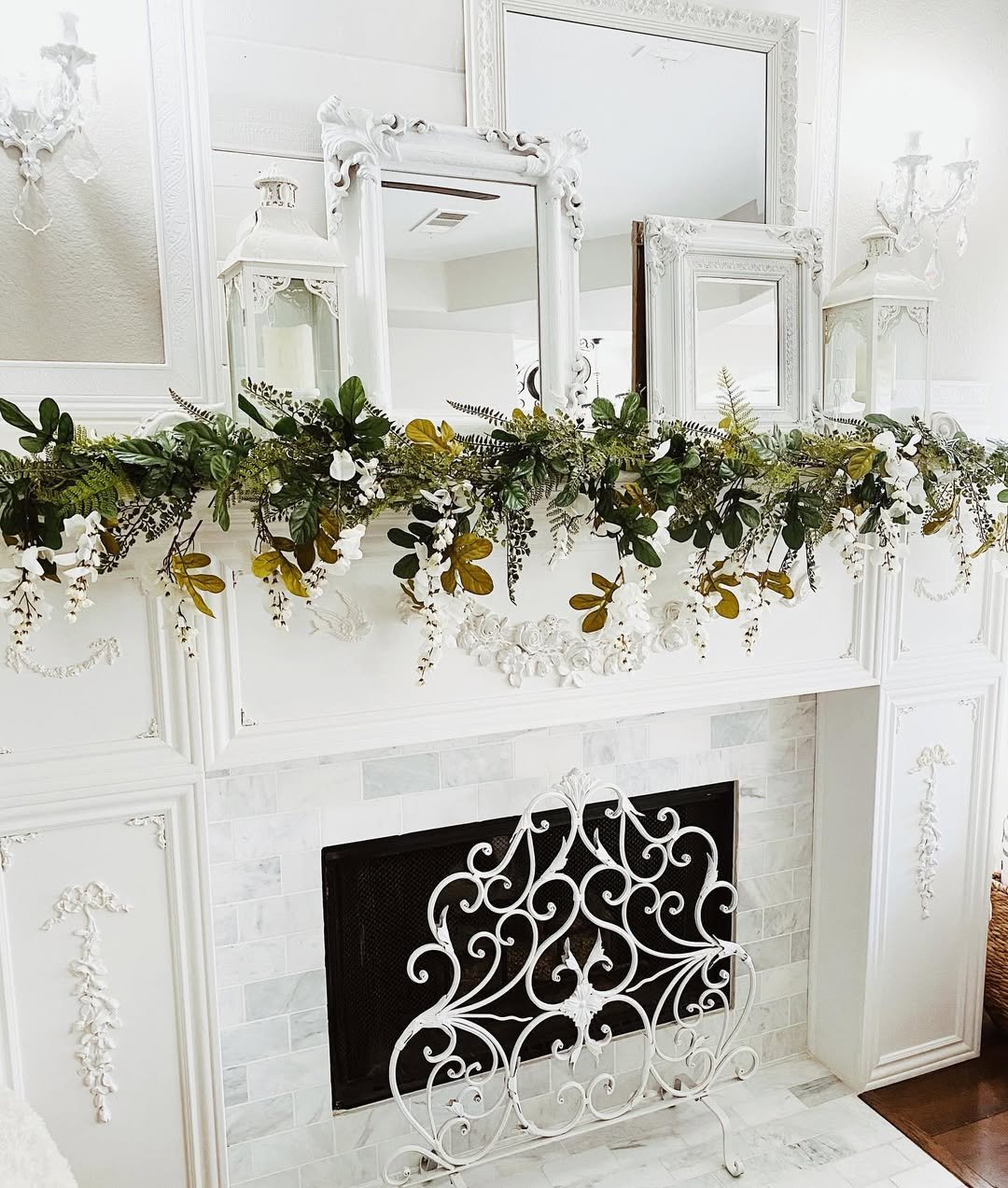 Ornate frames, layered mirrors, and trailing greenery come together in a way that feels straight out of a European cottage. The white-on-white palette lets the details shine without overwhelming the space.