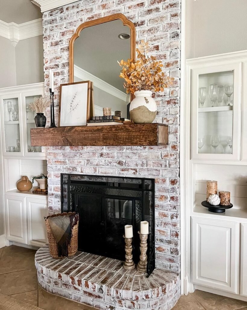 There’s a richness here that comes straight from the materials. Exposed brick, deep wood tones, and aged finishes give this fireplace a grounded, almost nostalgic feel.