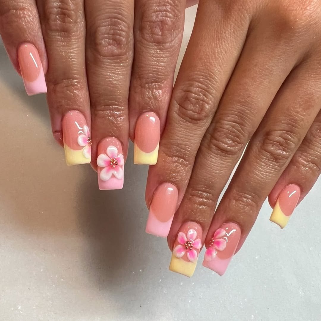 Soft pink melts into creamy yellow tips, finished with delicate 3D florals that feel straight out of a garden party. The square shape keeps it modern, while the tiny gold bead centers add just enough sparkle to catch the light.