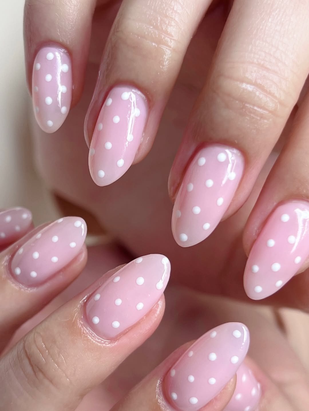 Glossy baby pink with tiny white polka dots brings back that sweet retro energy. The almond shape keeps it soft and flattering.
