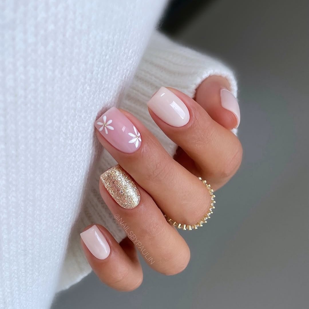 A milky pink base, tiny white daisies, and one glittery gold accent nail come together in the prettiest balance. The shape is short and practical, but the details keep it special.