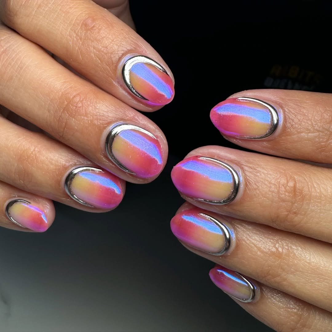 A soft rainbow ombré sits inside sleek silver chrome outlines, creating a framed, almost halo effect on each nail.