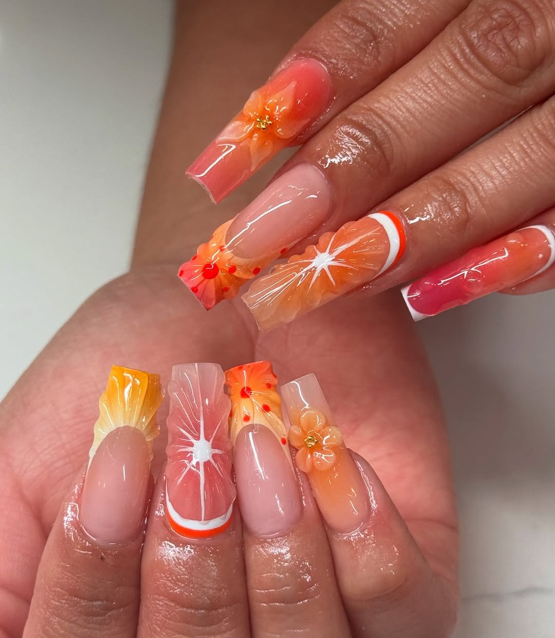 Juicy orange gradients, glossy 3D flowers, and subtle French details create a manicure that feels almost edible. The translucent layers give it that dewy, fruit-slice effect.
