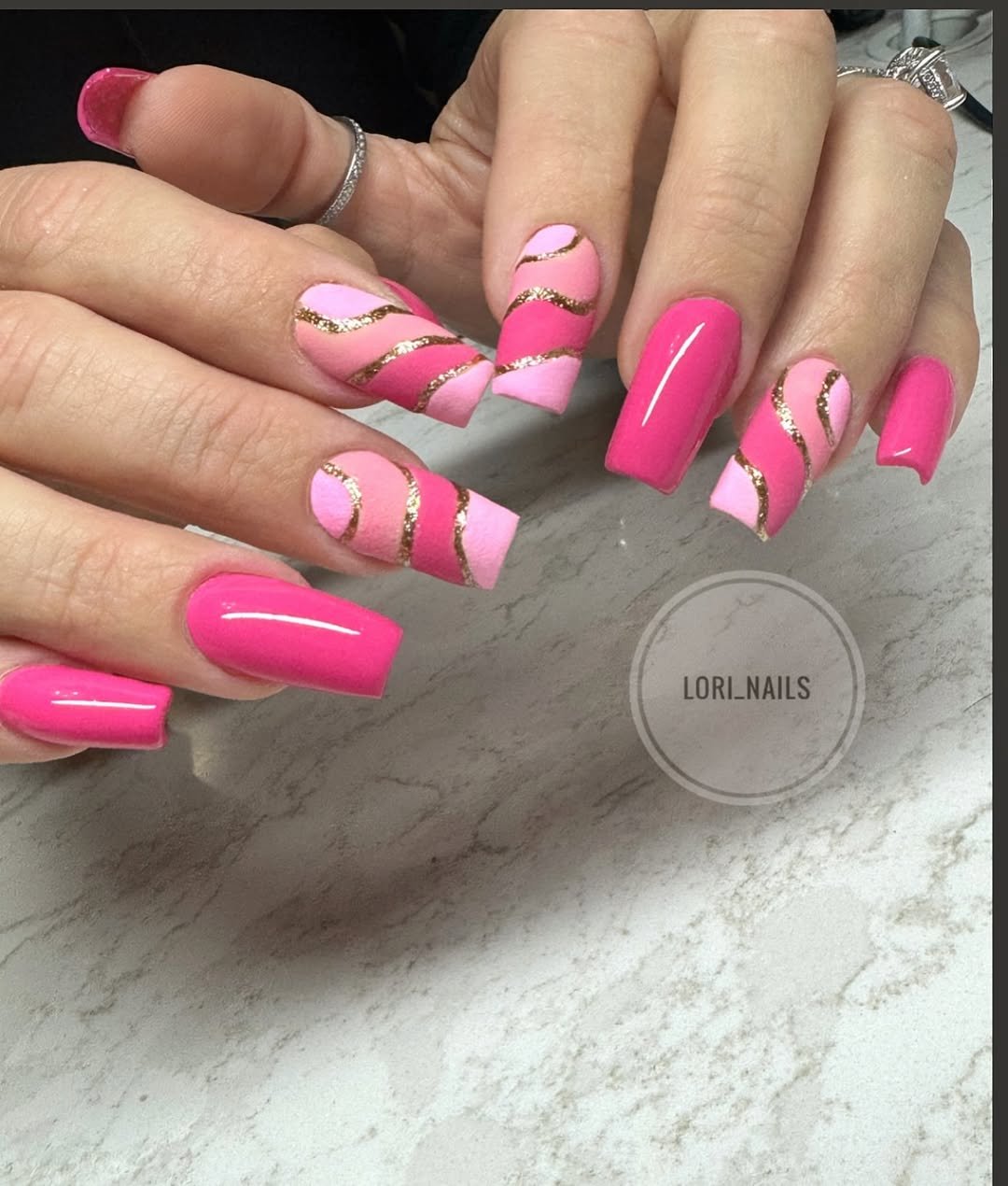 This set is pure spring confidence. Vibrant hot pink alternates with softer blush tones, all wrapped in delicate gold glitter waves that move across each nail like ribbon.