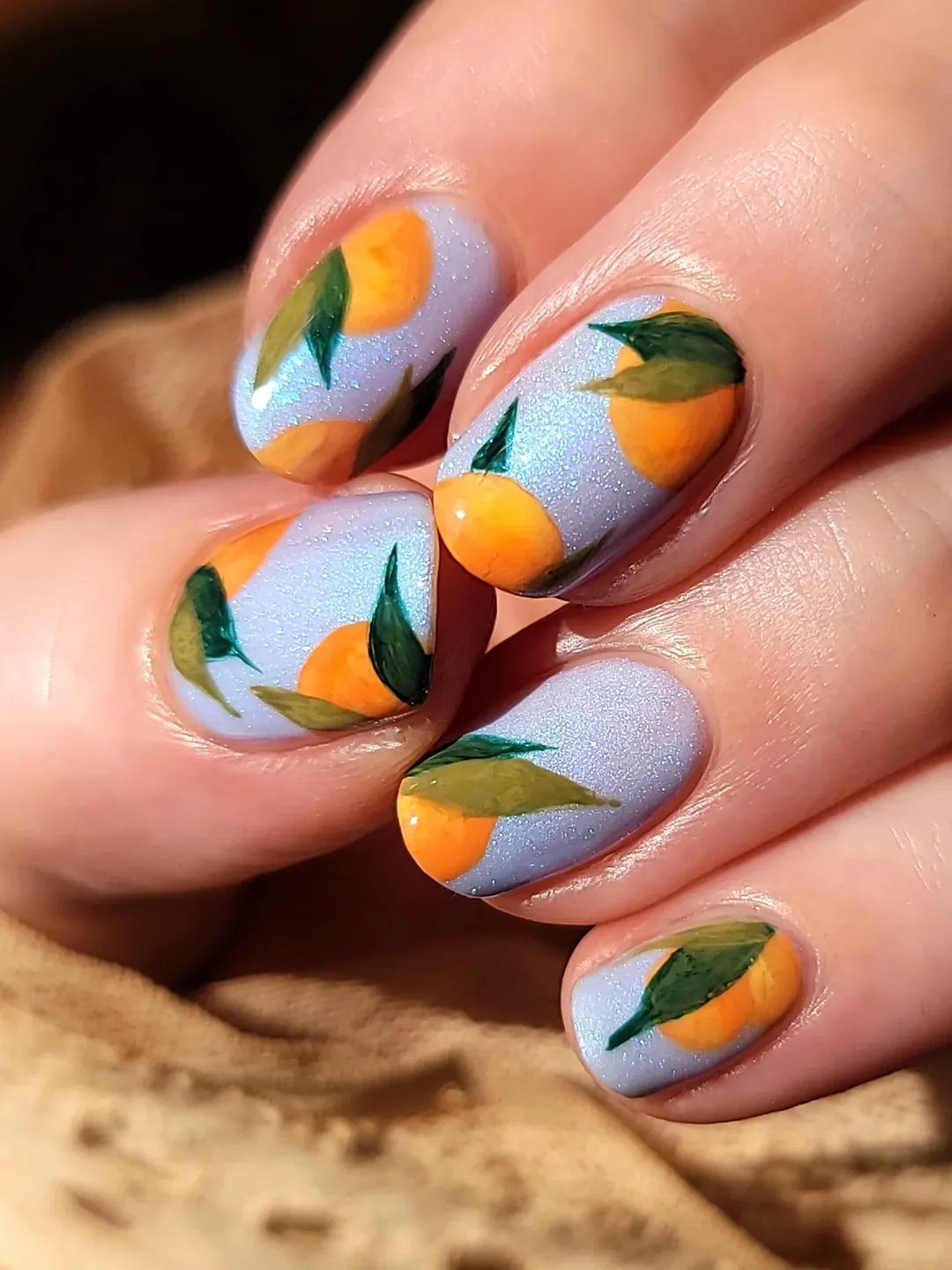 Tiny oranges with deep green leaves rest on a soft lavender shimmer base. The scale is what makes it charming. Small, neat, and almost storybook-like.