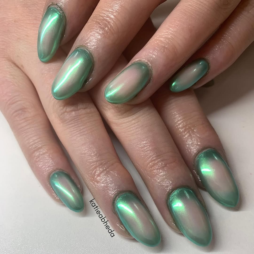A soft nude center fades into glowing mint chrome edges, creating a halo effect that feels futuristic yet fresh. The almond shape enhances the fluid finish.