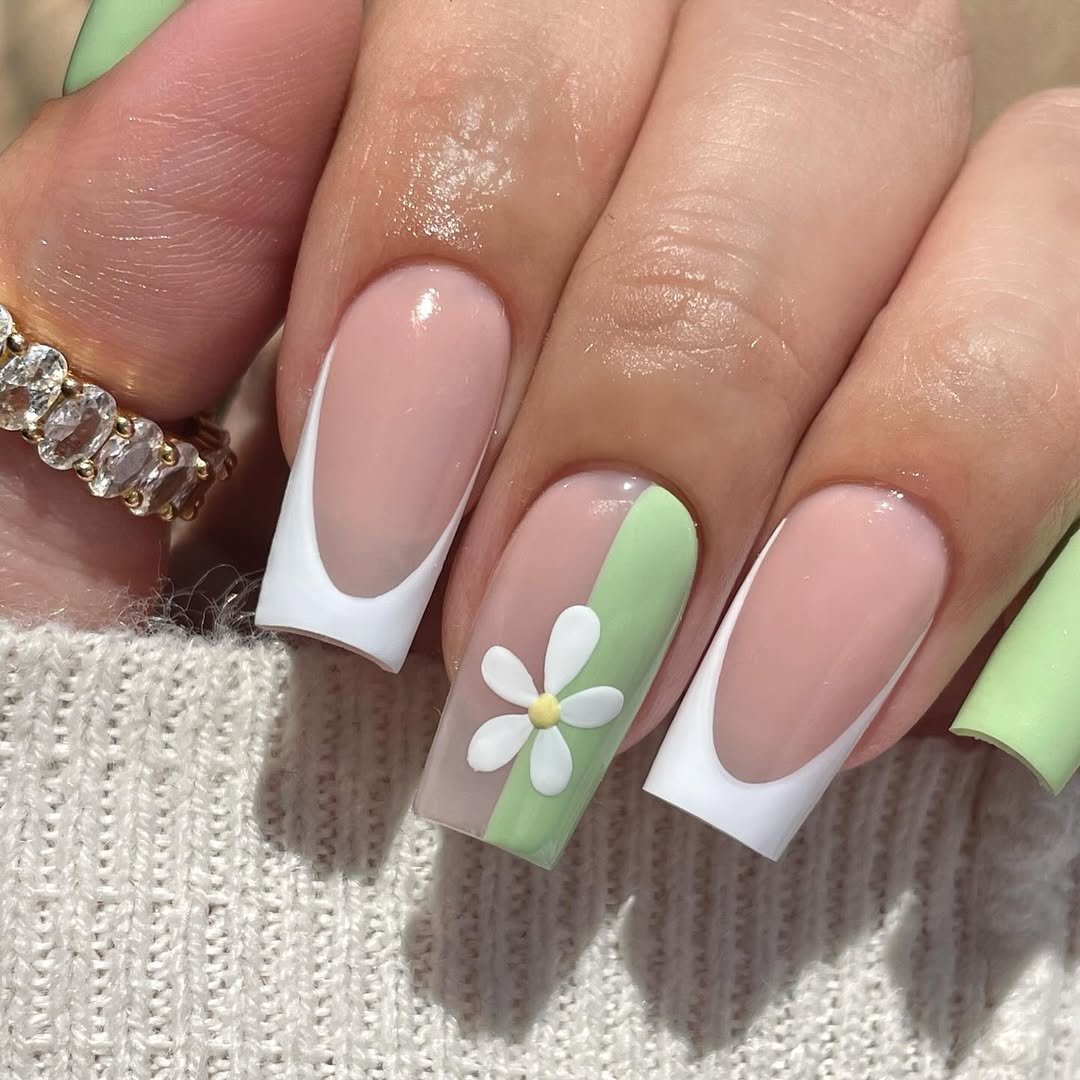 Classic white French tips meet a fresh swipe of mint and a single daisy accent. The structure of the square shape keeps it clean and timeless.