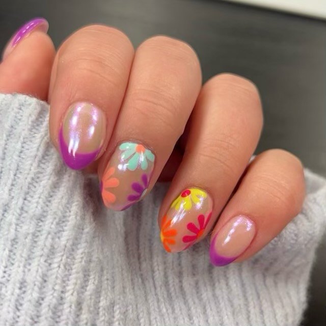A sheer glossy base meets punchy purple tips and scattered neon florals in coral, teal, and sunshine yellow. The finish is glassy, almost jelly-like, which makes the colors pop even more.