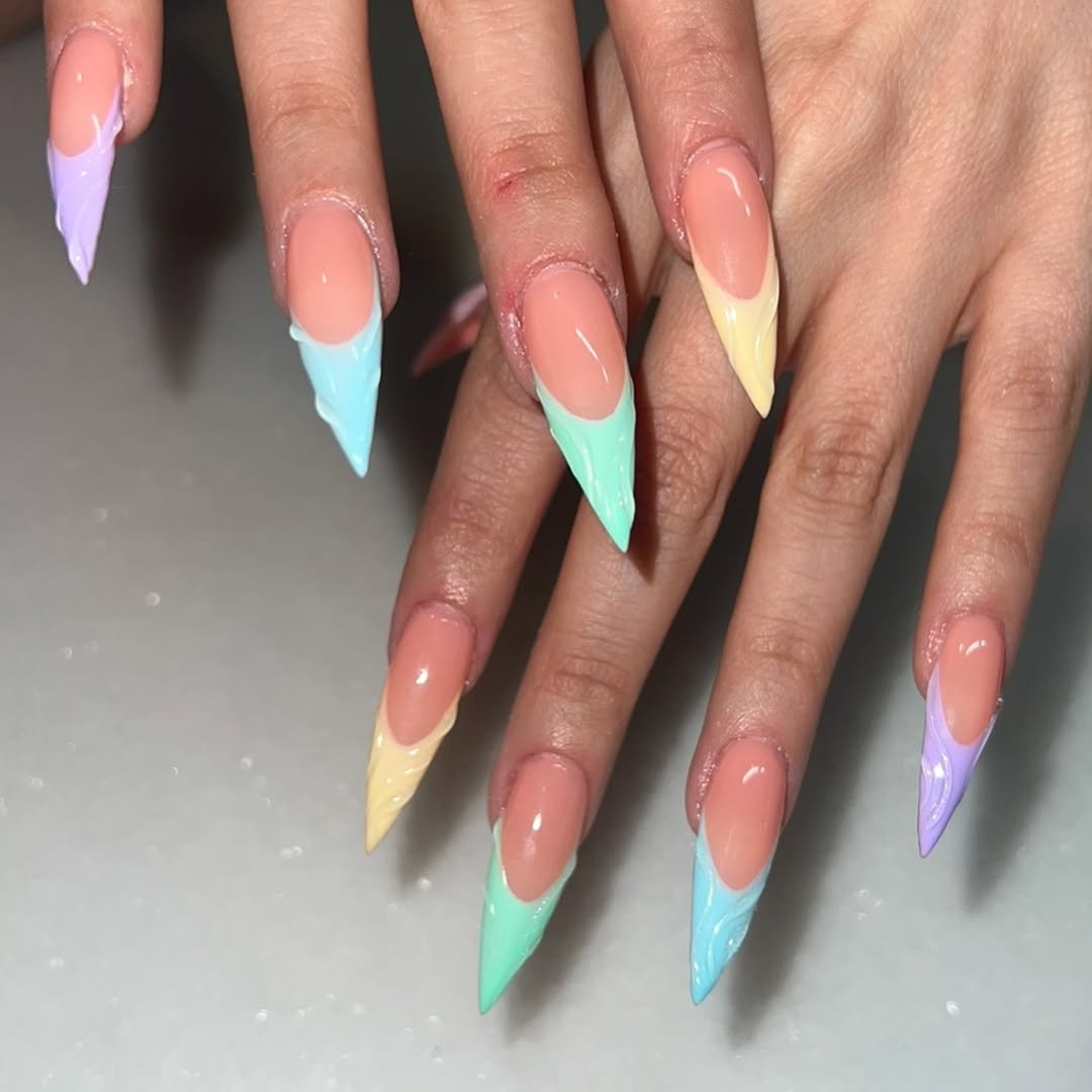 These stiletto nails take a nude base and let pastel shades drip over the tips in lilac, mint, baby blue, and soft lemon. The sculpted, almost melting effect feels playful without going over the top.