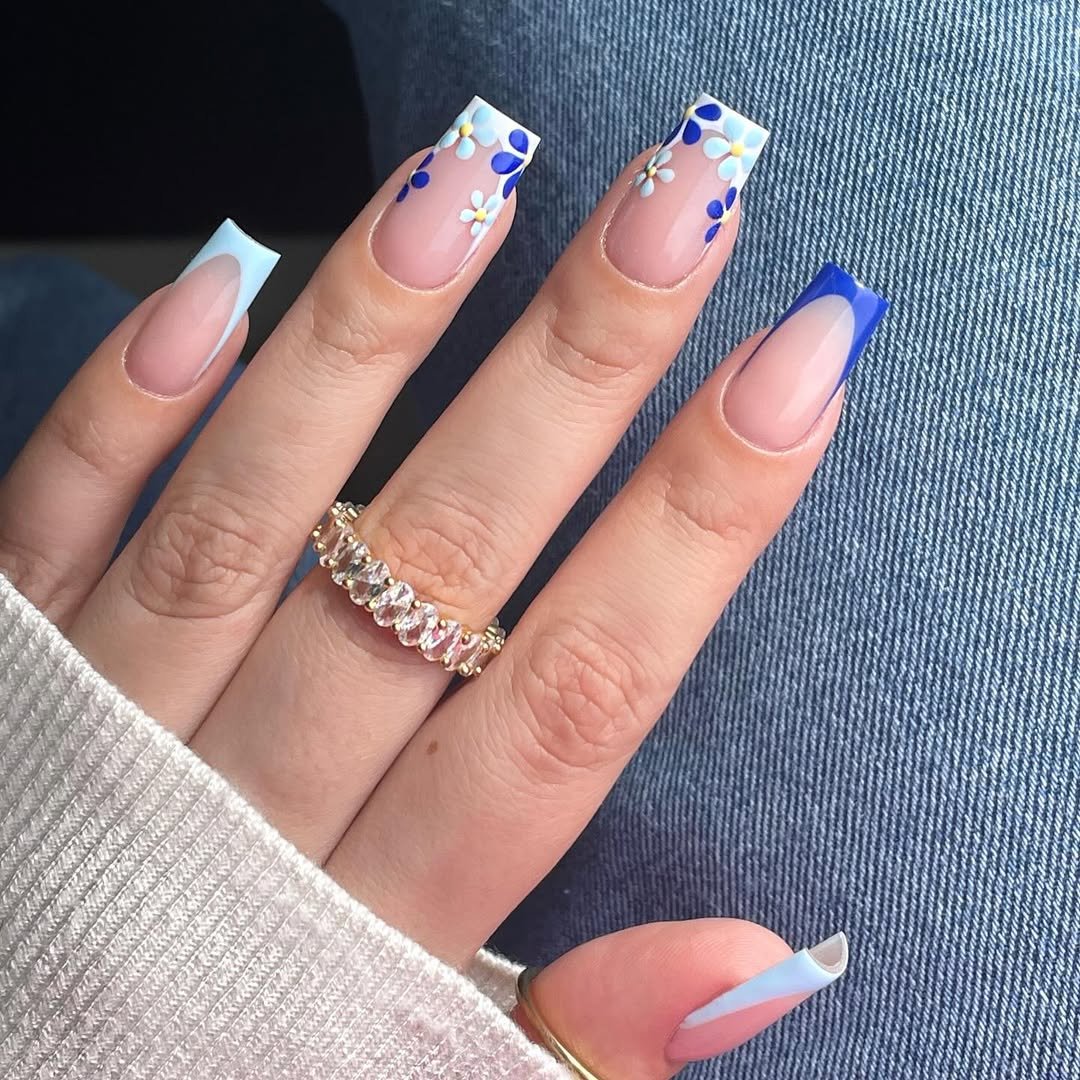 A classic nude base paired with alternating soft blue and white French tips, finished with dainty blue-and-white florals across the center nails.
