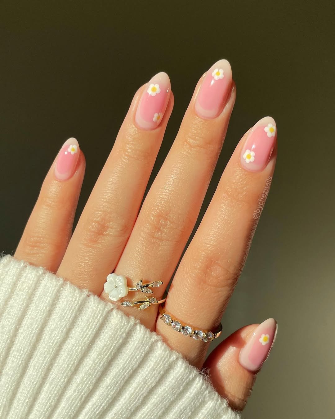 A gentle pink ombré melts into creamy white tips, scattered with tiny white daisies that look like they’ve just bloomed in morning light.