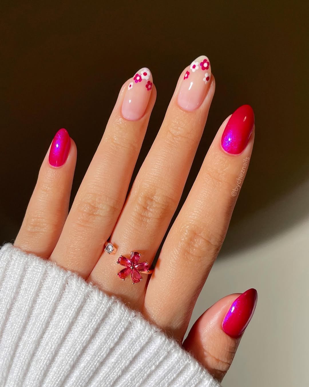 Soft nude bases meet tiny clusters of pink flowers along the tips, paired with bold raspberry solids that catch the light with a subtle shimmer.