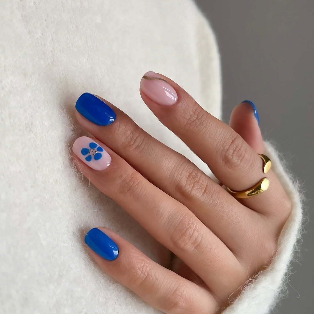 What makes this one work is the restraint. Not every nail is fighting for attention. The solid blue grounds the look, while the tiny floral and gold wave add just enough personality. It’s bold, but still polished enough for everyday.