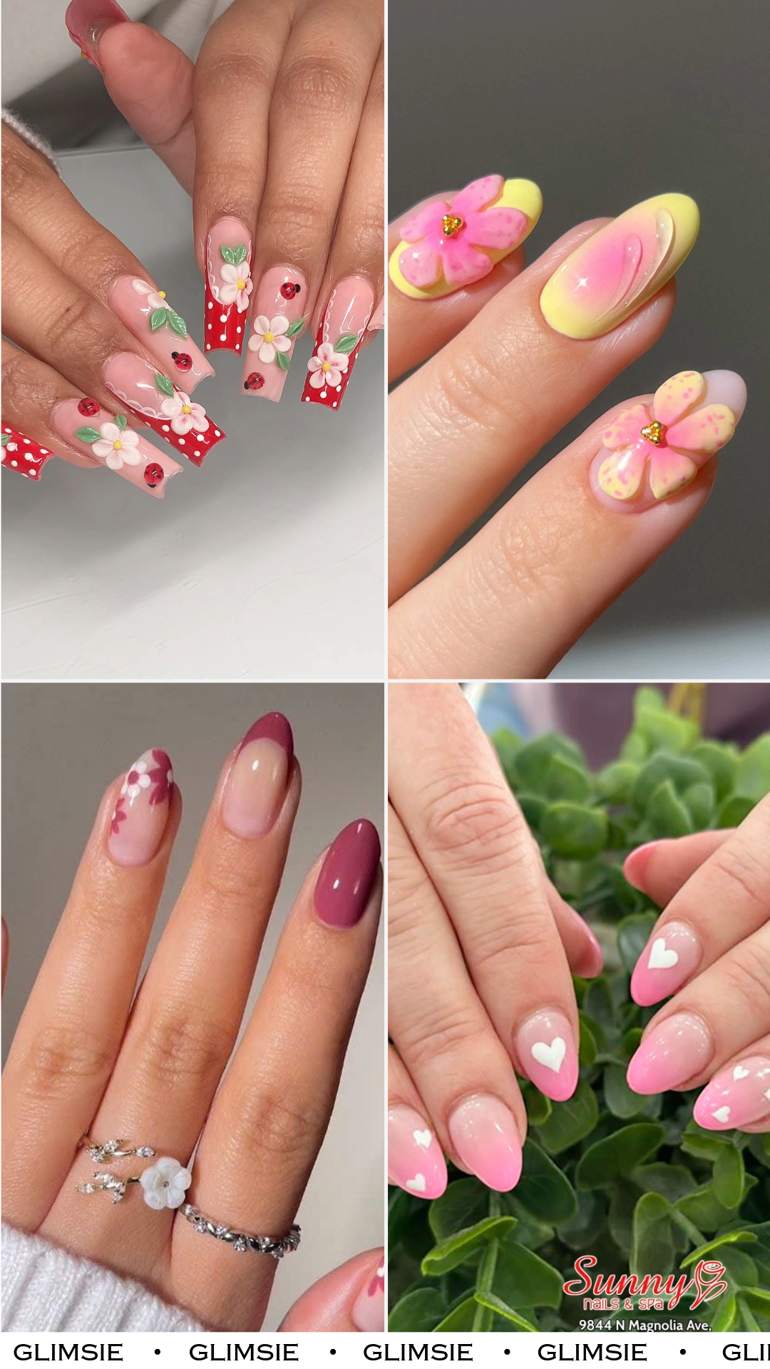 If spring were a dessert, it would look like this. Sheer blush bases meet red polka dot French tips, tiny strawberries, ladybugs, and even soft 3D blossoms that feel straight out of a countryside picnic.