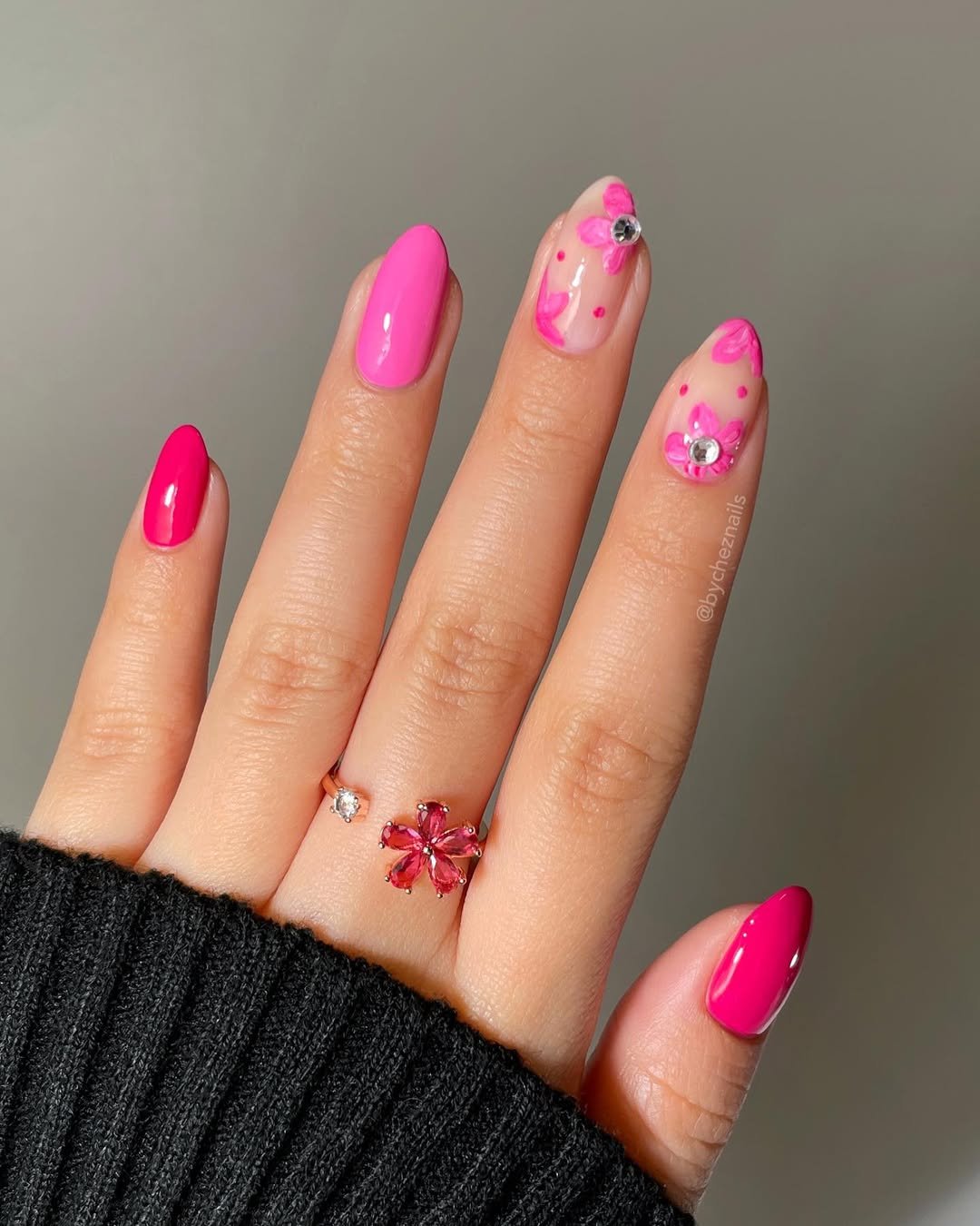 Vivid fuchsia steals the show here, balanced with sheer accent nails dotted in playful pink petals and a hint of crystal sparkle at the center.