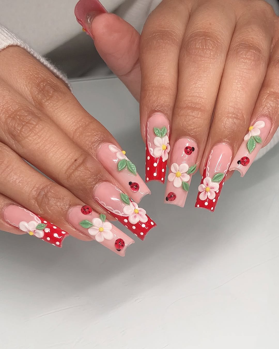 Long square nails dressed in blush pink, red polka dot French tips, tiny white blossoms, and the cutest little ladybugs scattered across the set.