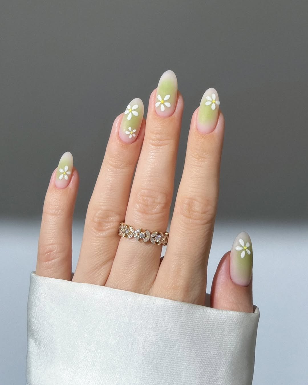 A soft green ombré fades into a milky base, finished with tiny white daisies placed just so across each almond nail.