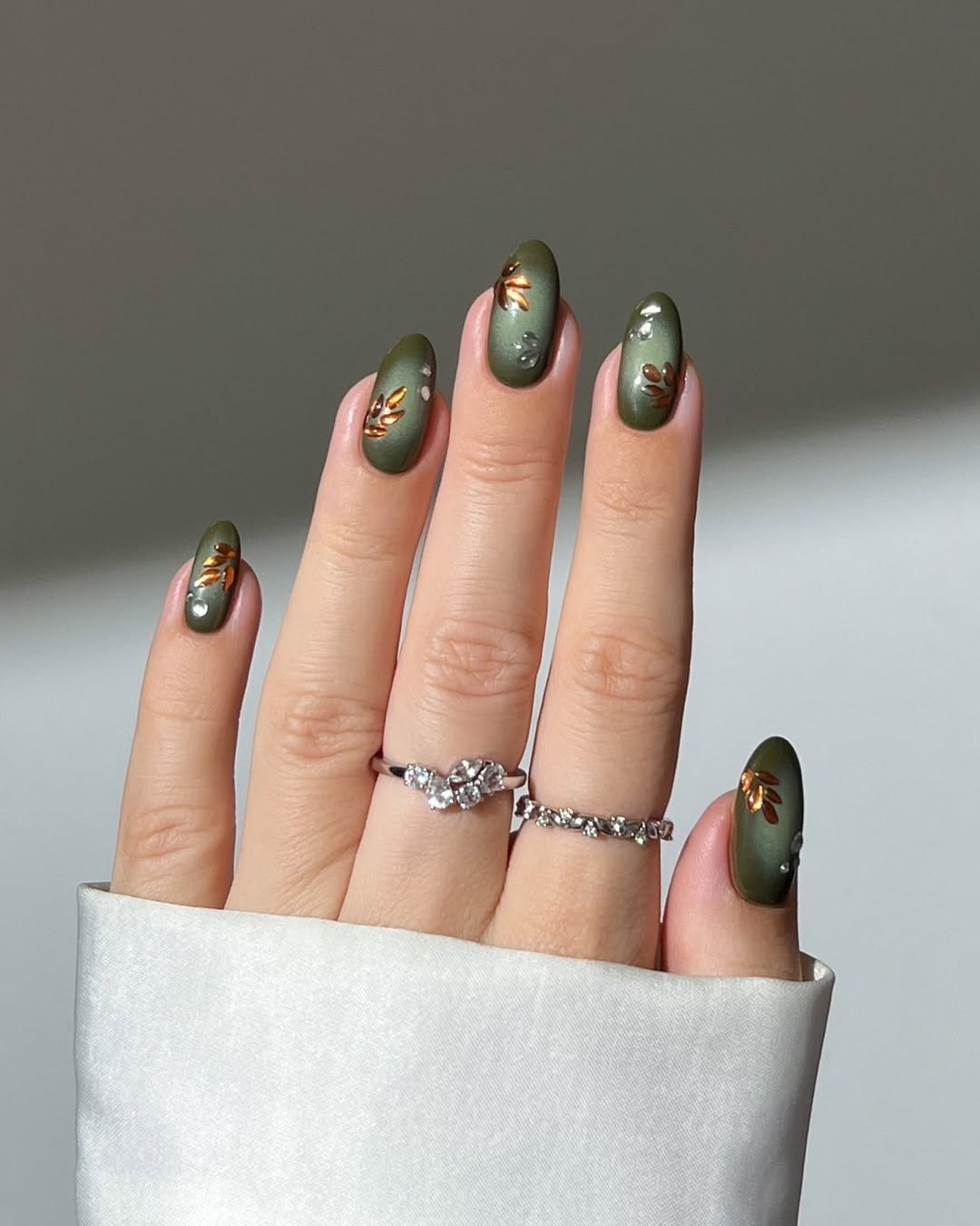 Deep olive green coats each nail in a satin-like finish, accented with small metallic leaf details and subtle dew-drop textures.