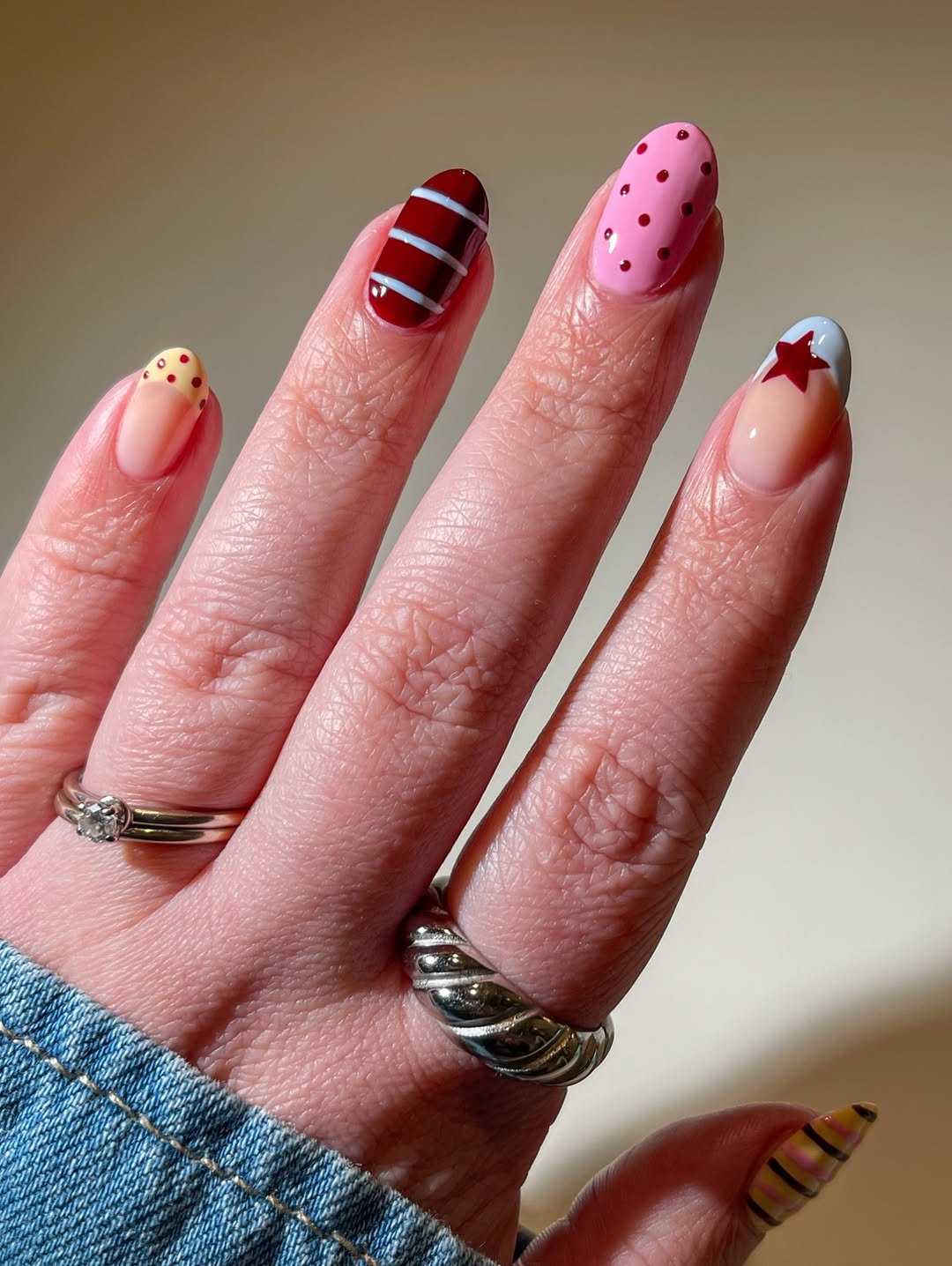 Each nail tells a different story. Red stripes, pink polka dots, a bold red star, even a striped accent that feels straight out of a vintage candy shop.