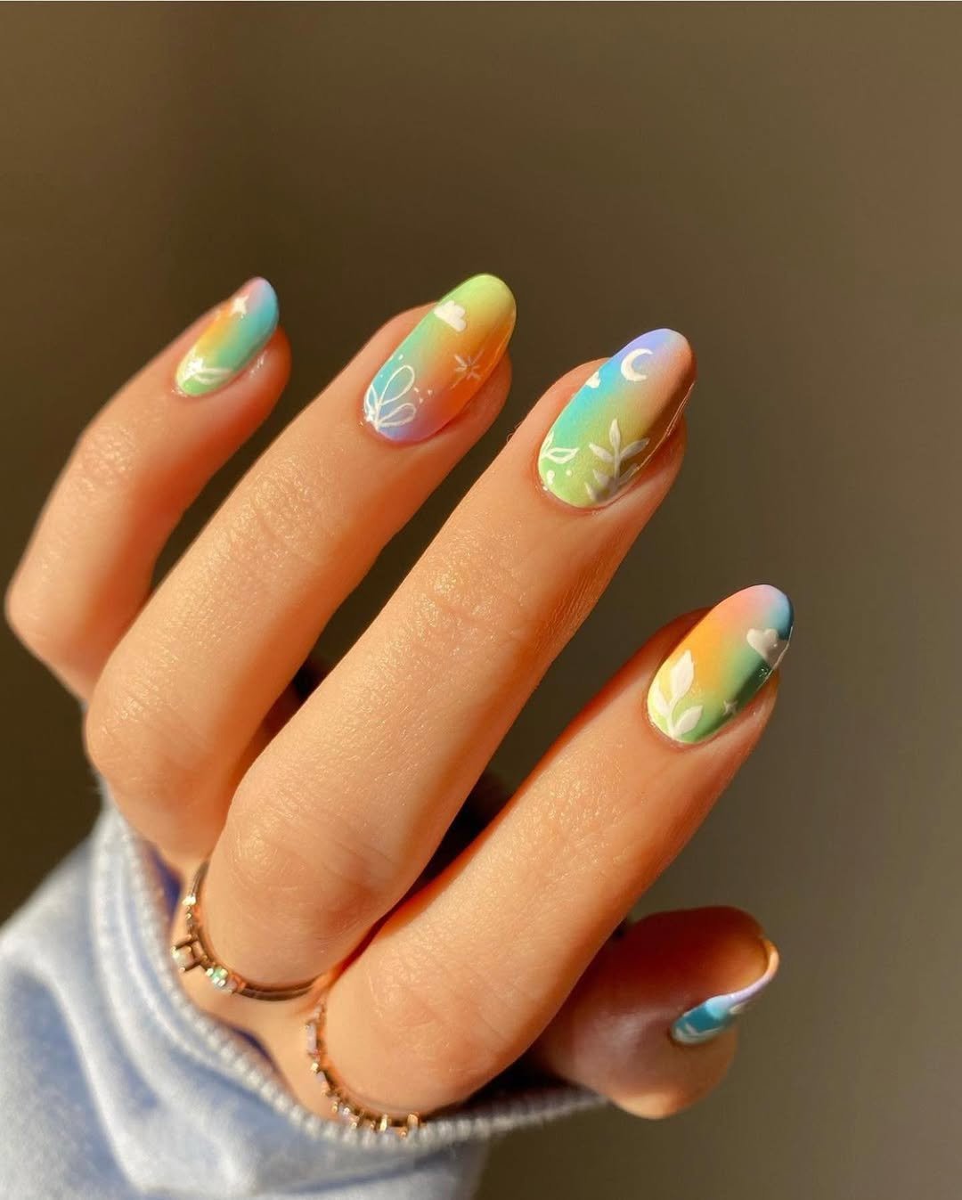A dreamy gradient blends coral, mint, lemon, and sky blue across almond nails, finished with tiny white celestial and botanical line details.