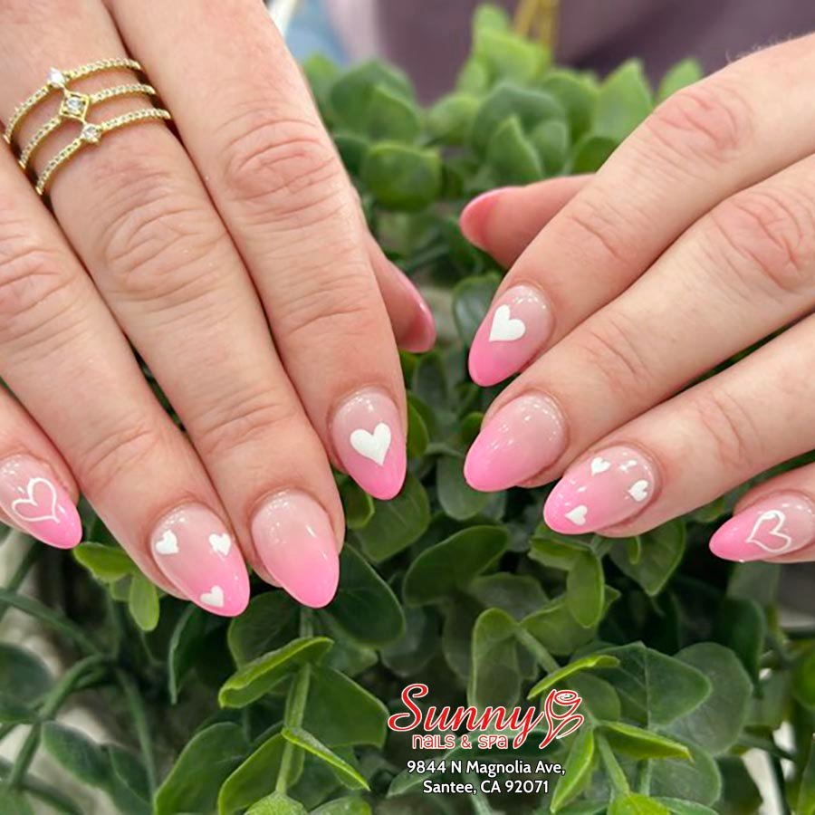 A blush-to-pink gradient melts across each almond nail, scattered with tiny white hearts that feel light and airy.