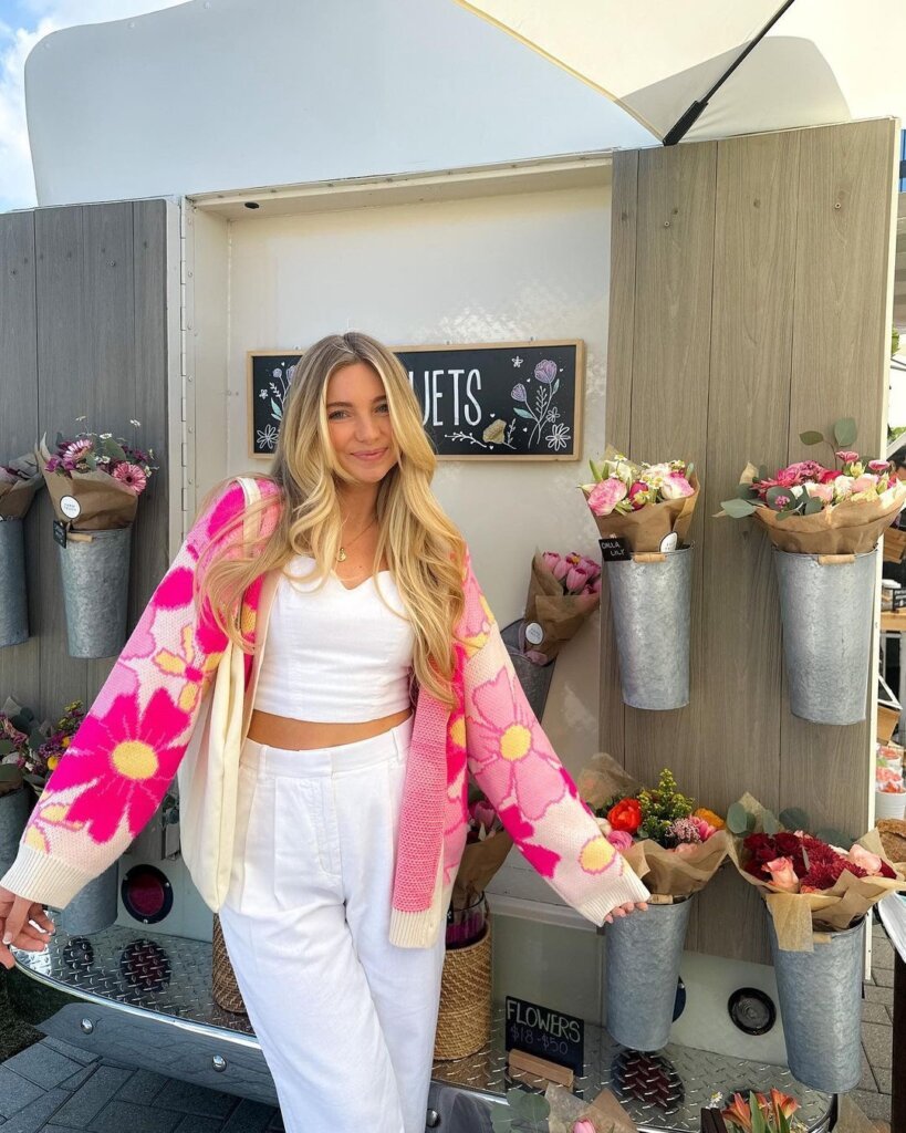 Ending on the happiest note, this outfit is pure spring energy. The bold floral cardigan paired with crisp white layers feels joyful, confident, and impossible to ignore—in the best way.