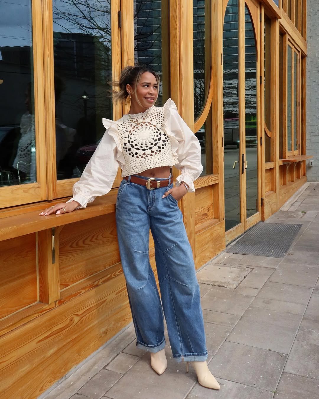 Ending on a cozy note, this look blends comfort with polish. Light denim, a cropped top, and a soft neutral cardigan feel perfect for transitional spring days.