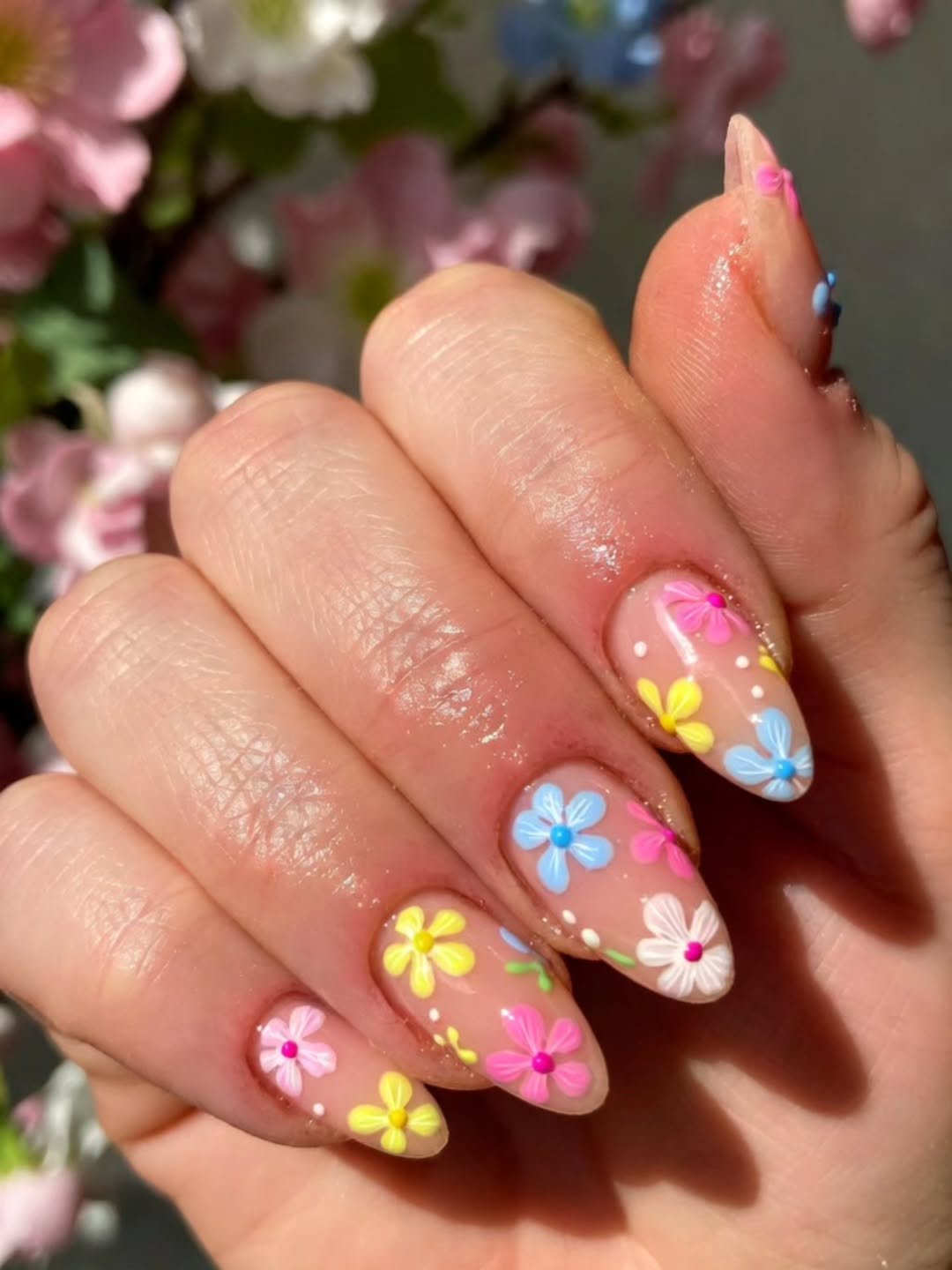 If you love playful nails, this design feels like a tiny flower field on your fingertips. Bright pink, blue, yellow, and white daisies are scattered across a sheer base, creating a cheerful and lively look.