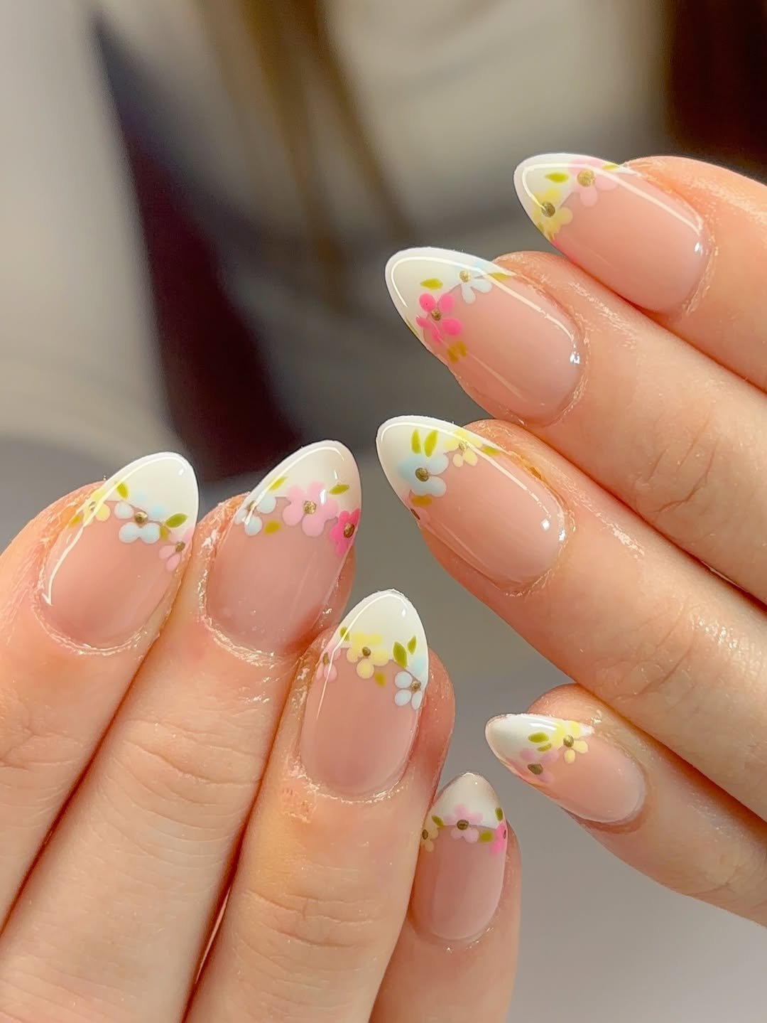 There’s something incredibly elegant about this manicure. The classic white French tip sets the foundation, but those tiny pastel flowers along the edge add just enough detail to make it feel fresh and modern.